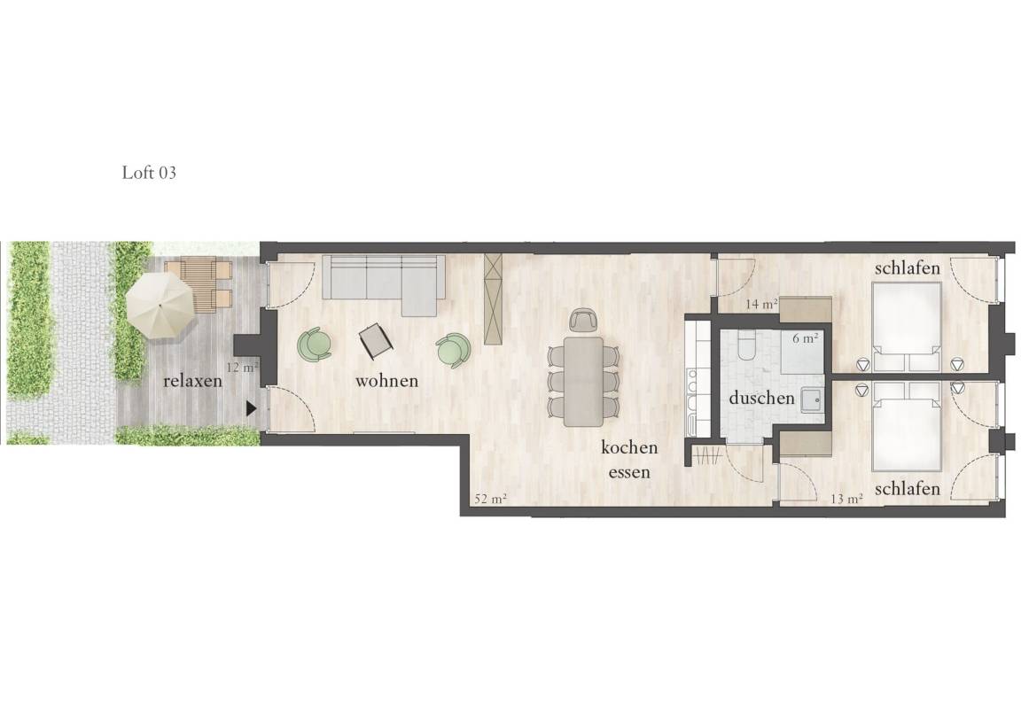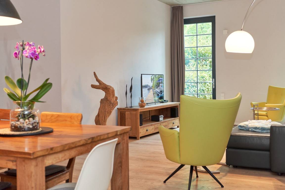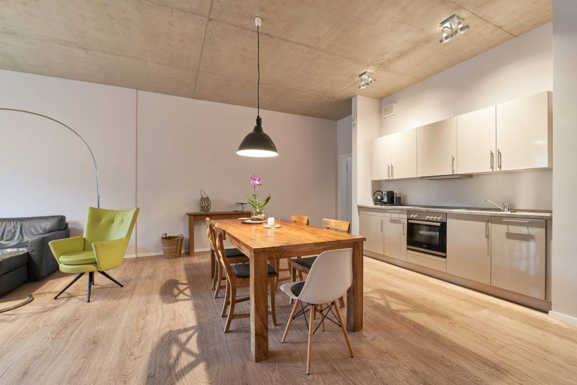Die Ferienwohnung liegt im Erdgeschoss der ehemaligen Färberei der Kammgarnspinnerei und zeichnet sich durch ihre geräumige und großzügige Raumaufteilung (85m²) aus. Sie ist in Gänze barrierefrei und somit auch uneingeschränkt rollstuhlgeeignet. Die gut geschnittene, viel Platz bietende und komfortabel ausgestattete Loft-Ferienwohnung ist durch Aufbettung nicht nur für 4 sondern auch für 6 Personen geeignet. Die Bereitstellung von Kinderreisebetten und Hochstühlen ist nach Vorbestellung jederzeit möglich.