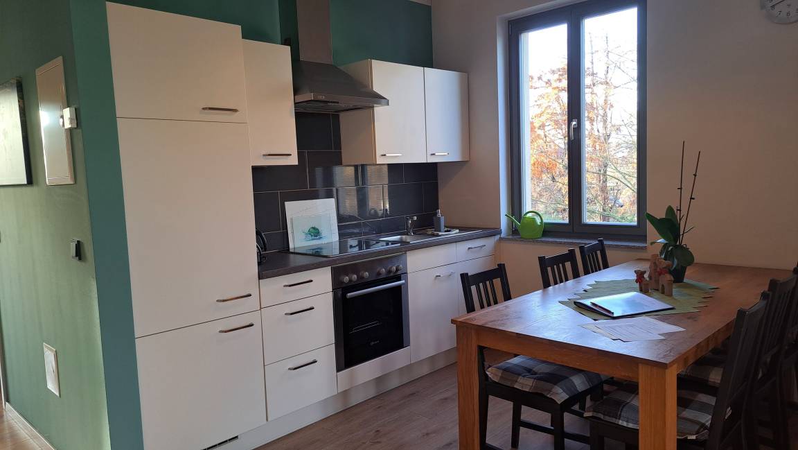Die Küche enthält einen Kühlschrank mit integriertem Gefrierfach, Geschirrspüler und einen Ceranherd mit 4 Kochzonen sowie einem Backofen.