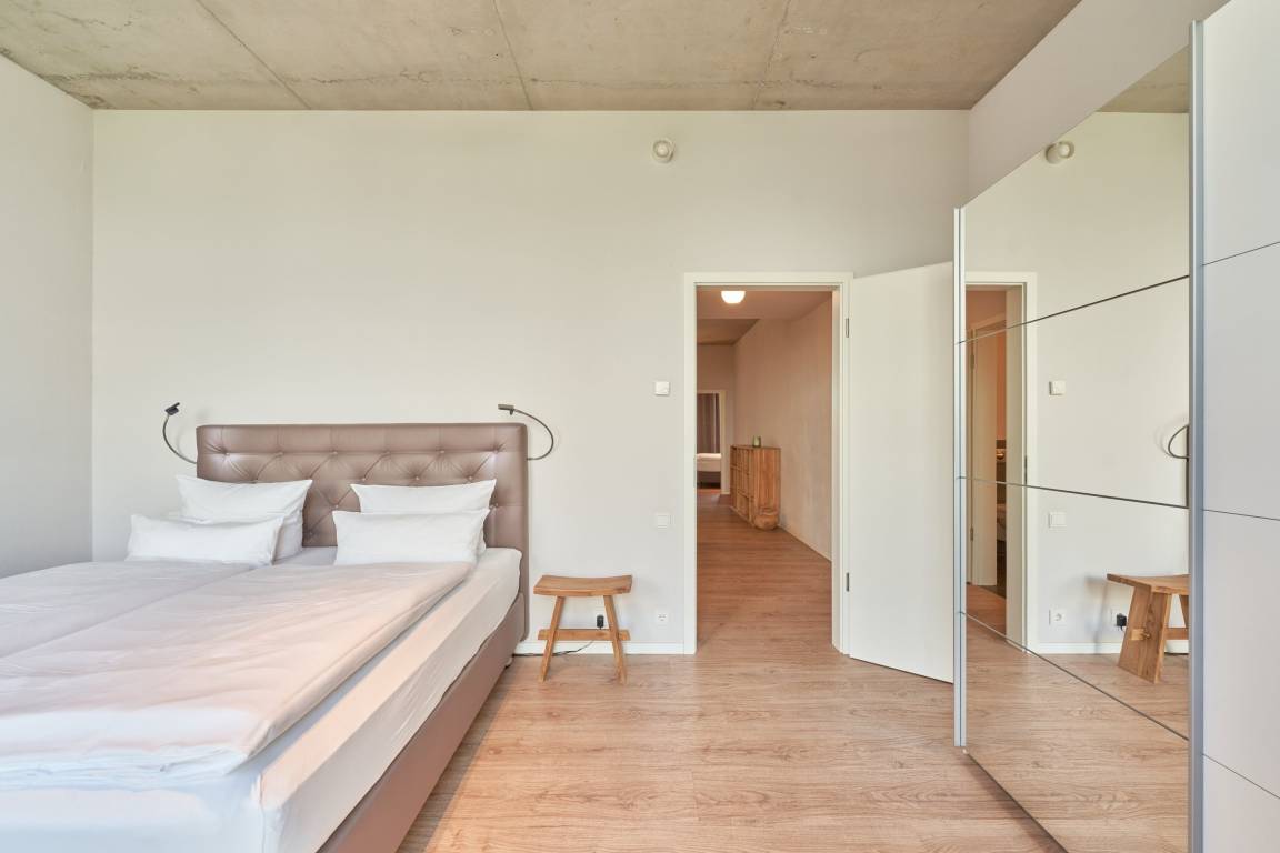 Die beiden sehr großen Schlafzimmer sind jeweils mit einem überlangen (2,10 m), komfortablen Boxspringbett versehen. Ebenfalls haben beide Schlafräume einen Schwebetürenschrank. Eine der Türen ist jeweils mit einem Ganzkörperspiegel versehen. Ein Schlafzimmer befindet sich an der Westseite und das andere an der Ostseite der Wohnung.