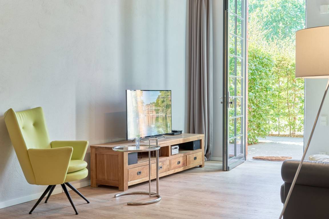 Im Wohnbereich laden die italienischen Sofas und Sessel zum Relaxen ein. Der große Flachbildschirm mit Kabelanschluss und angeschlossenem Blue-Ray-Player sorgen für vielfältige Unterhaltung. Die Stereoanlage bietet über den Bluetooth-Zugang auch die Möglichkeit Ihre eigene Musik zu genießen. In der Wohnung ist selbstverständlich auch WLAN vorhanden.