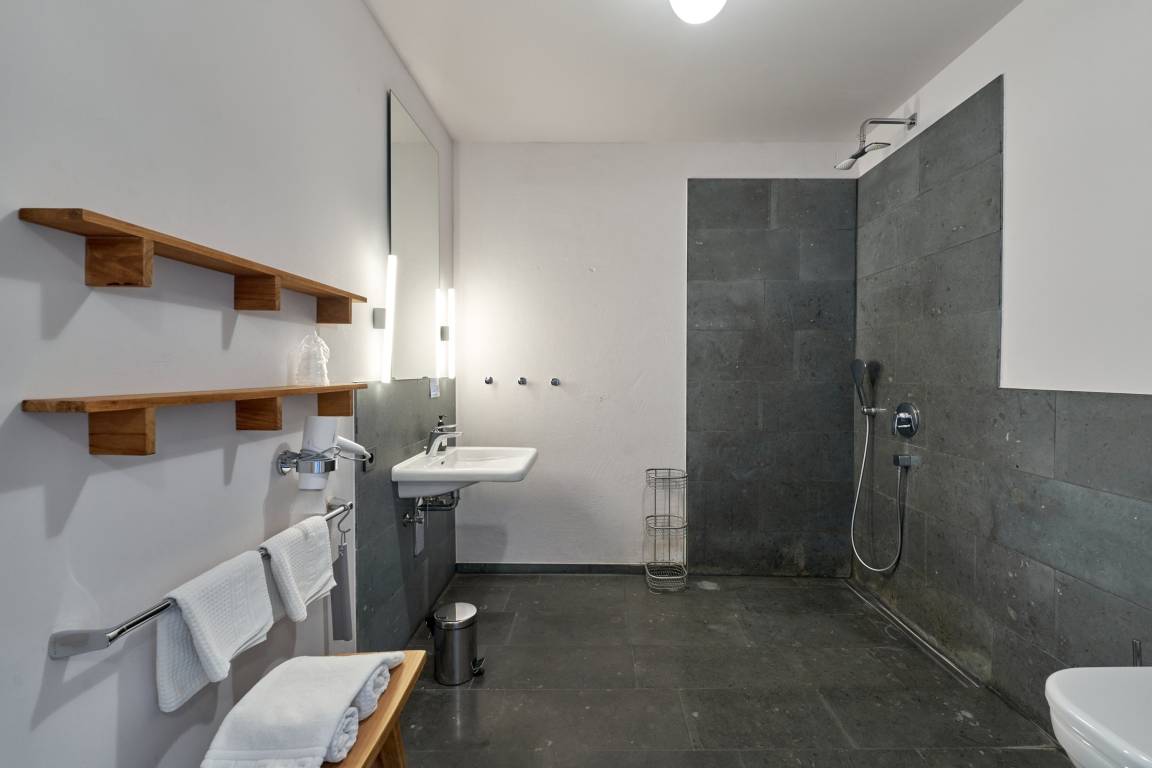 Die bodengleiche Dusche verfügt neben der Schlauchbrause auch über eine „Regenkopfdusche". Das Waschbecken ist mit einem gut ausgeleuchteten, großformatigen Spiegel versehen. Das es für Rollstuhlfahrer unterfahrbar ist, ist für uns selbstverständlich. Zur Ausstattung des Bades gehört auch ein Fön. Hand- und Duschtücher liegen für Sie bereit.