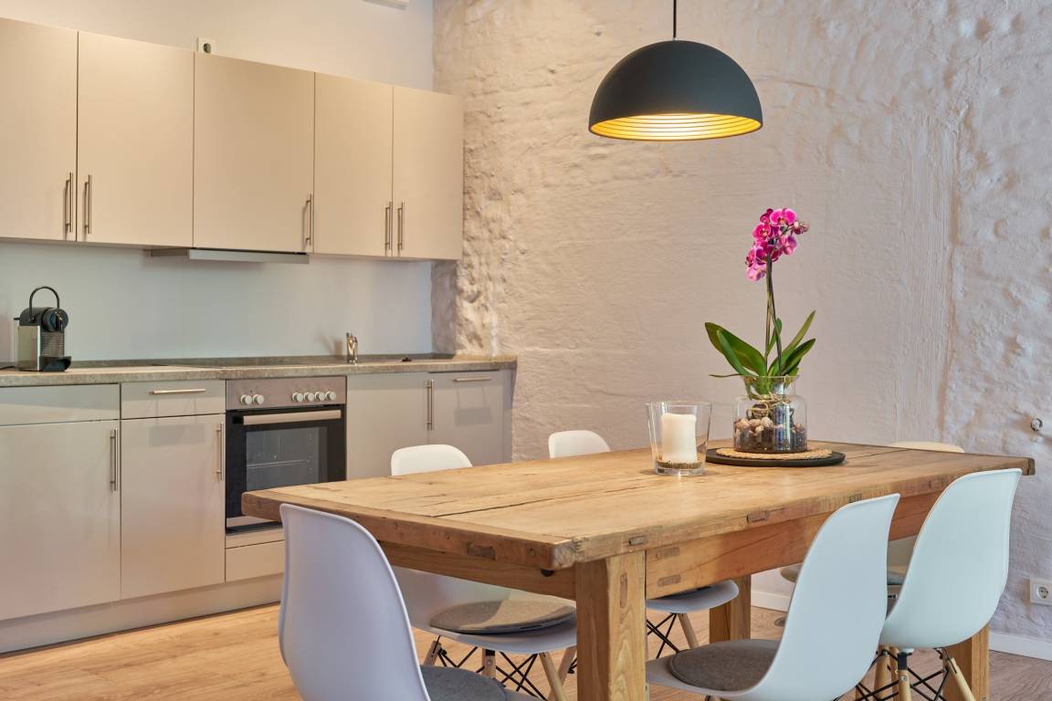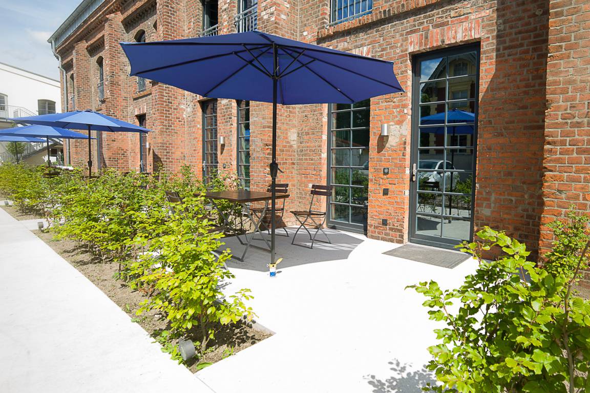 Die Ferienwohnung liegt im Erdgeschoss der ehemaligen Färberei der Kammgarnspinnerei und zeichnet sich durch ihre geräumige und großzügige Raumaufteilung (86m²) aus. Sie ist in Gänze barrierefrei und somit auch uneingeschränkt rollstuhlgeeignet. Die gut geschnittene, viel Platz bietende und komfortabel ausgestattete Loft-Ferienwohnung ist für 4 Personen geeignet. Die Bereitstellung von Kinderreisebetten und Hochstühlen ist nach Vorbestellung jederzeit möglich.