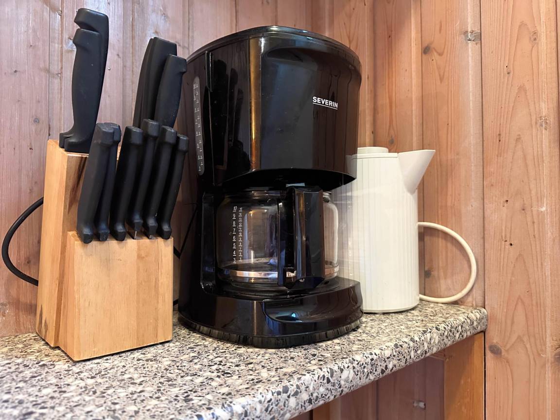 Layout : Parterre: Eingang, Küche mit Wasserkocher, Toaster, Kochherd(4 Kochplatten, elektrisch), Kaffeemaschine(Filter), Kühlschrank(+ Gefrierfach) , Wohn/Esszimmer mit TV, Esstisch, Ofen(Pellet-Holzofen ), Sitzecke , Schlafzimmer mit Doppelbett(90 x 200 cm) , Schlafzimmer mit 2x Einzelbett(90 x 200 cm) , Badezimmer mit Dusche, Waschbecken, Toilette , Balkon