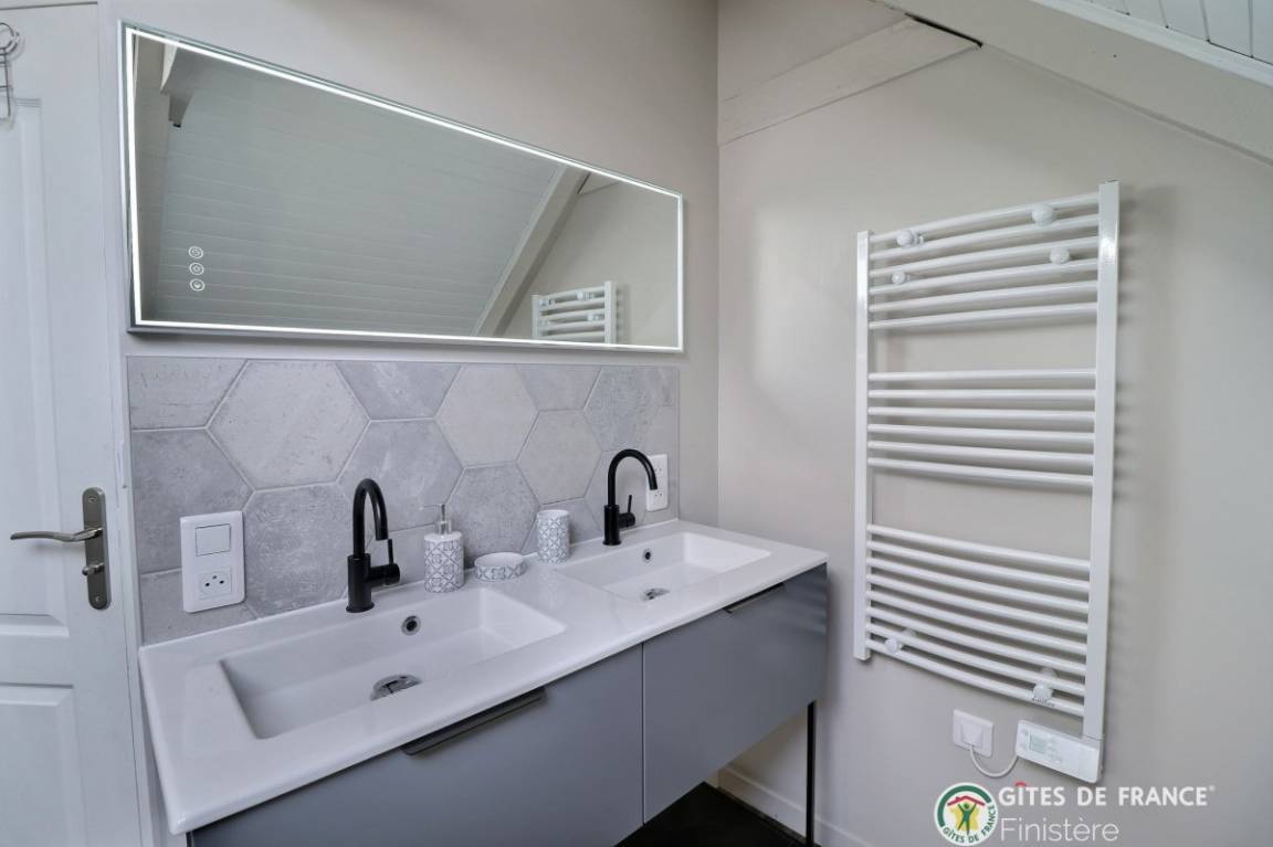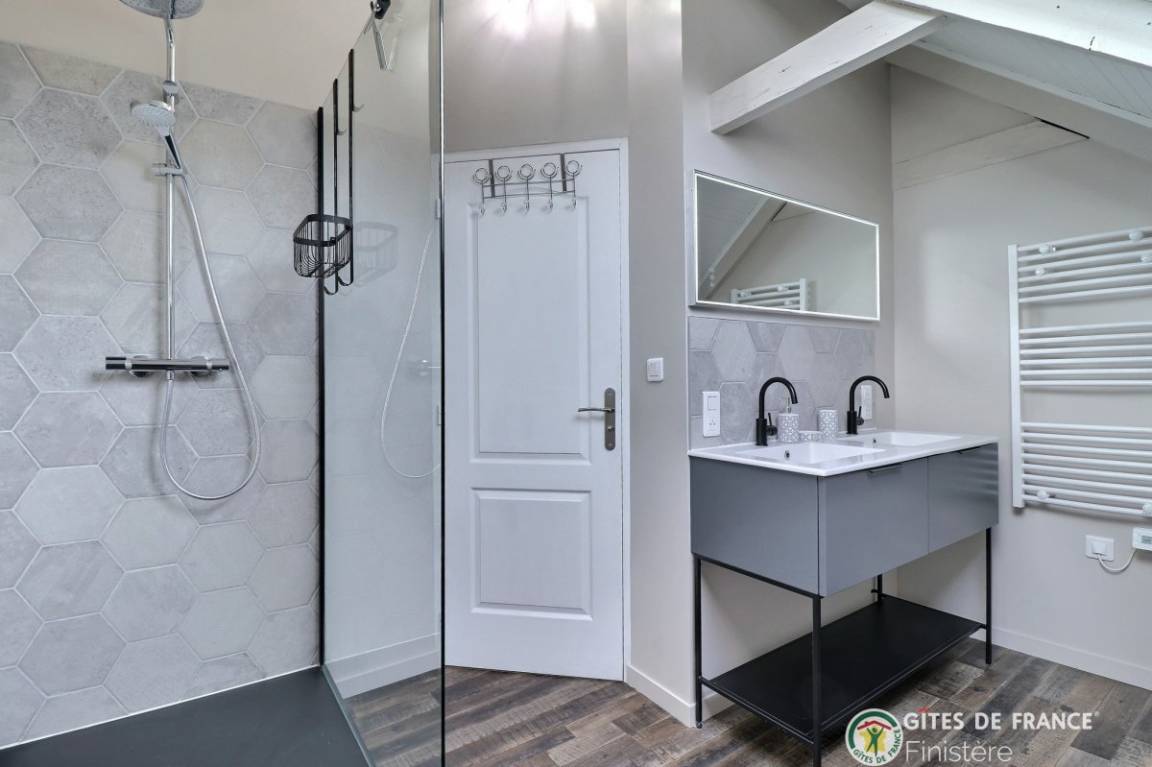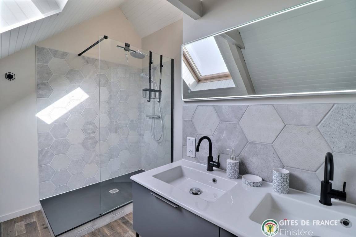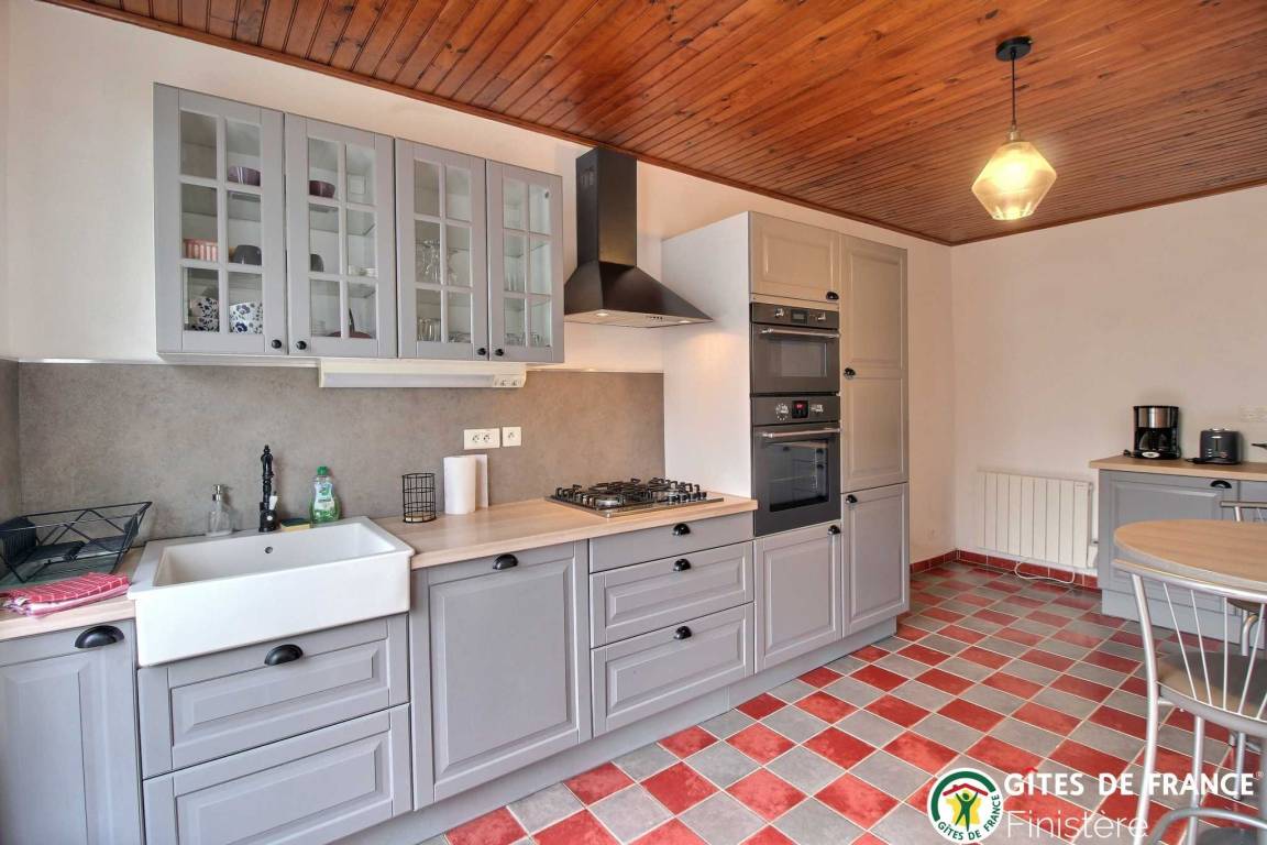 „La maison est très spacieuse et équipée de tout le confort. Bons lits, salle de bain moderne et grande douche à l'italienne. La cuisine est très bien équipée, même s'il nous manquait une casserole et une poêle de taille moyenne. L'espace de vie avec deux excellents canapés est superbe. Le garage est plutôt un espace de rangement très spacieux, car il ne peut pas être utilisé pour la voiture. C'est dommage que le parterre de fleurs à côté de la terrasse soit devenu trop haut, de sorte que vous n'avez plus de vraie vue sur le beau jardin. L'emplacement est une excellente base pour découvrir le Finistère. Tout pour des vacances réussies !“