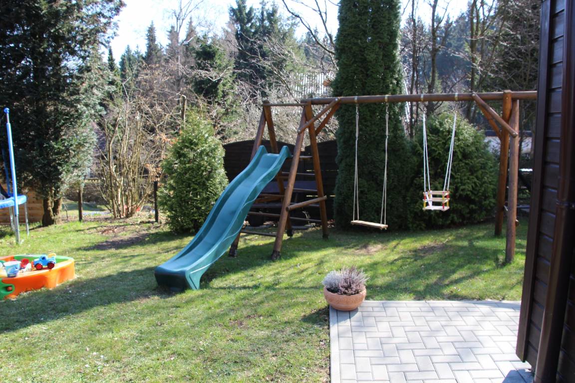 Das 600 m² große Grundstück bietet Spiel- und Liegewiese, Grill und