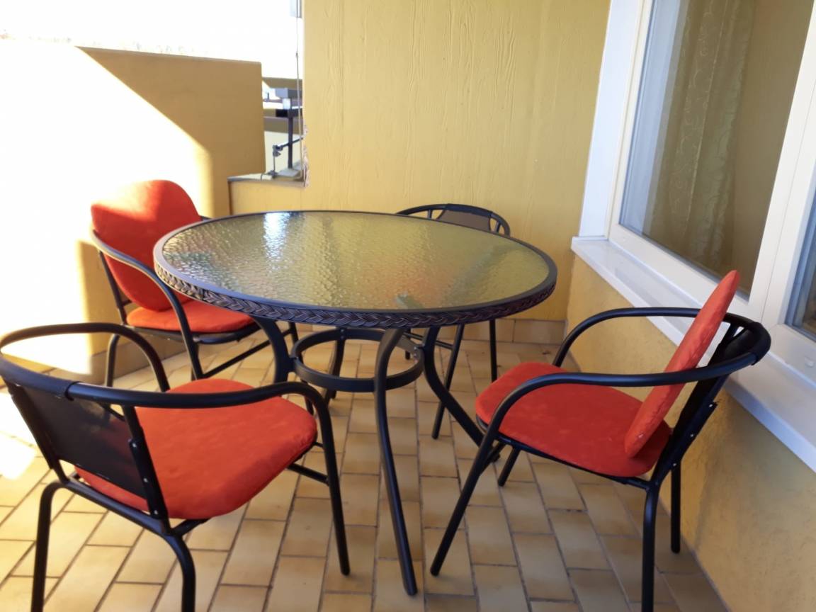 Auf dem Balkon, der nach Westen ausgerichtet und mit Sitzmöbeln ausgestattet ist, können Sie die Aussicht oder auch ab Mittag die Sonne bei einem Kaffee genießen.