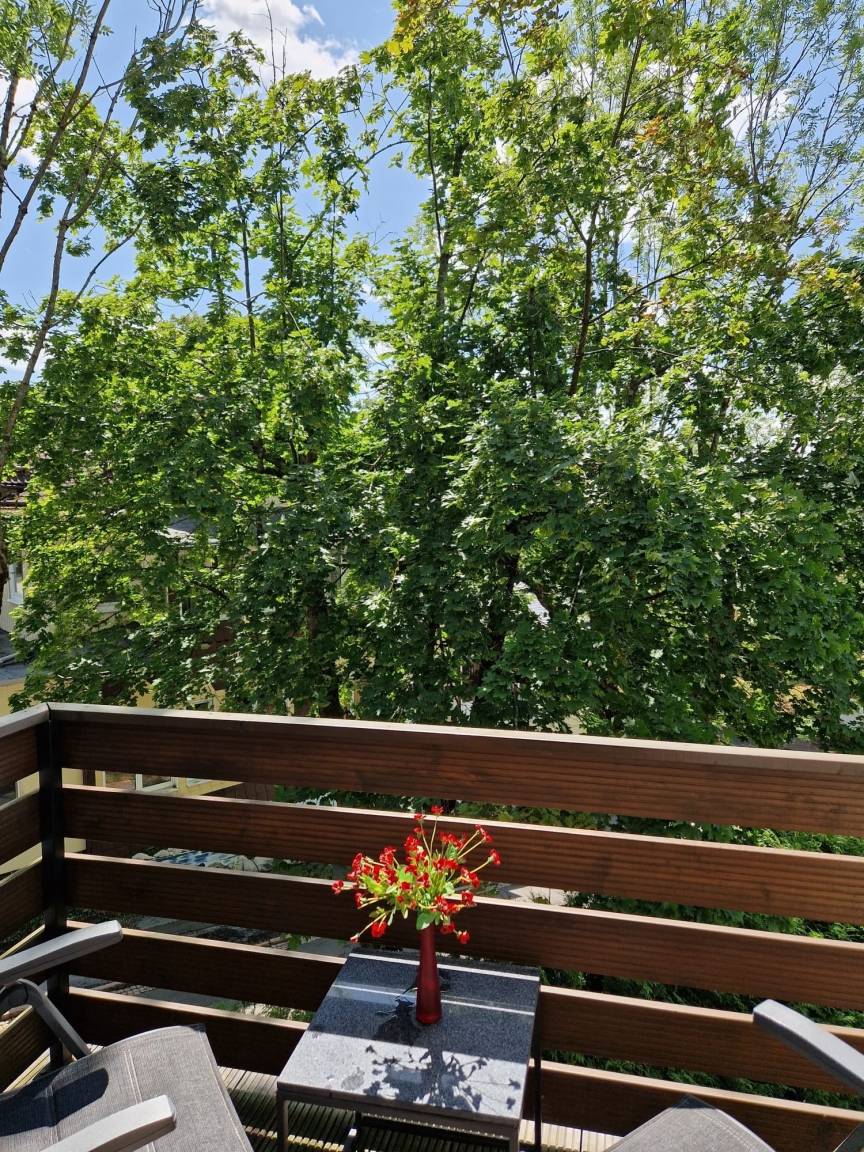 Loft für zwei Personen. Wohn-, Ess- und Schlafbereich in einem Raum , separatem Badezimmer mit Badewanne und einem Balkon.