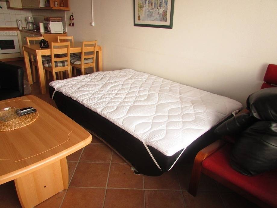 Modern ausgestattete, Nichtraucher- Ferienwohnung mit einem Schlafraum mit Doppelbett (1,80 x 2,00 m) und Stockbett für die Kinder im zweiten Schlafraum. Die Schlafbereiche sind durch eine Glasschiebetür getrennt, Offene Küche mit Essecke und Wohnraum mit Schlafsofa umd extra Topper (1,40 x 2,00 m).