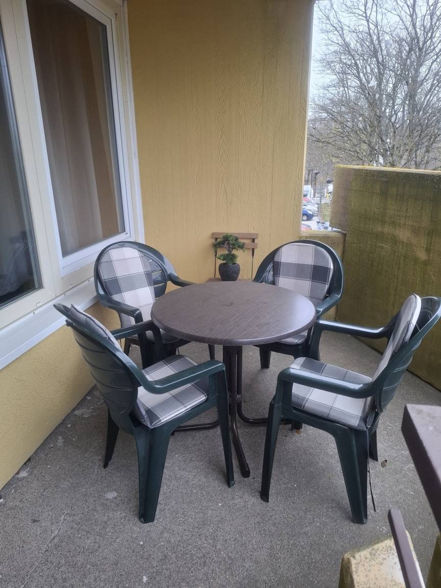 Ein geräumiger Balkon mit Sitzmöbeln und Babyreisebett und Hochstuhl sind vorhanden