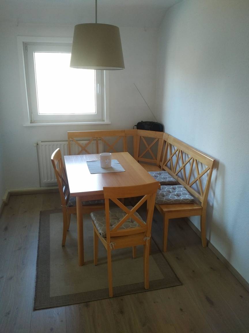 Das angrenzende Esszimmer ist mit einer gemütlichen modernen Eckbank und Stühlen und einem ausziehbaren Tisch ausgestattet. Ein Radio finden sie hier auch. Gesellschaftsspiele für Jung und Alt sind ausreichend vorhanden. Für unsere "kleinen" Gäste haben wir zudem jeweils eine Kiste mit Lego Duplo und eine Kiste mit Playmobil-Spielzeug zum Spielen vor Ort.
