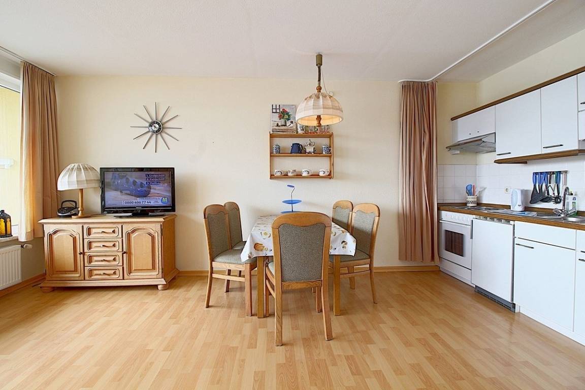 2 Raum-Ferienwohnung mit 1 Schlafzimmer mit 2 Einzelbetten, großzügigem Wohnraum mit Schlafsofa, Essecke und Küchenzeile, sowie Ausgang zum sonnigen Südbalkon.