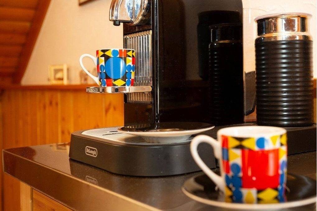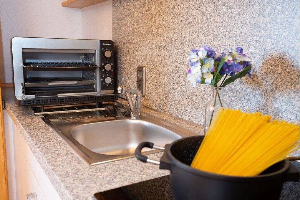 Wohnzimmer mit Küchenzeile und Essplatz, Kaffeemaschine ,,Nespresso Maschine,Wasserkocher, Backofen, Toaster, , Wohnteil mit 2 Relaxsessel, Magenta TV,RTL + und Netfix, Bad mit Dusche und WC,Fön.,Pflegemittel
