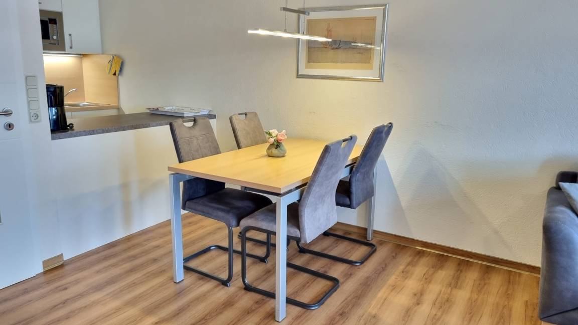 Komplett modernisierte Nichtraucher- Ferienwohnung mit einem Schlafraum mit Doppelbett (1,80 x 2,00 m) und Stockbett für die Kinder im zweiten Schlafraum, Küchenzeile mit Essecke und Wohnraum. Der Wohn-und Schlafbereich ist mit Vinylbodenbelag ausgestattet und daher auch für Allergiker geeignet.