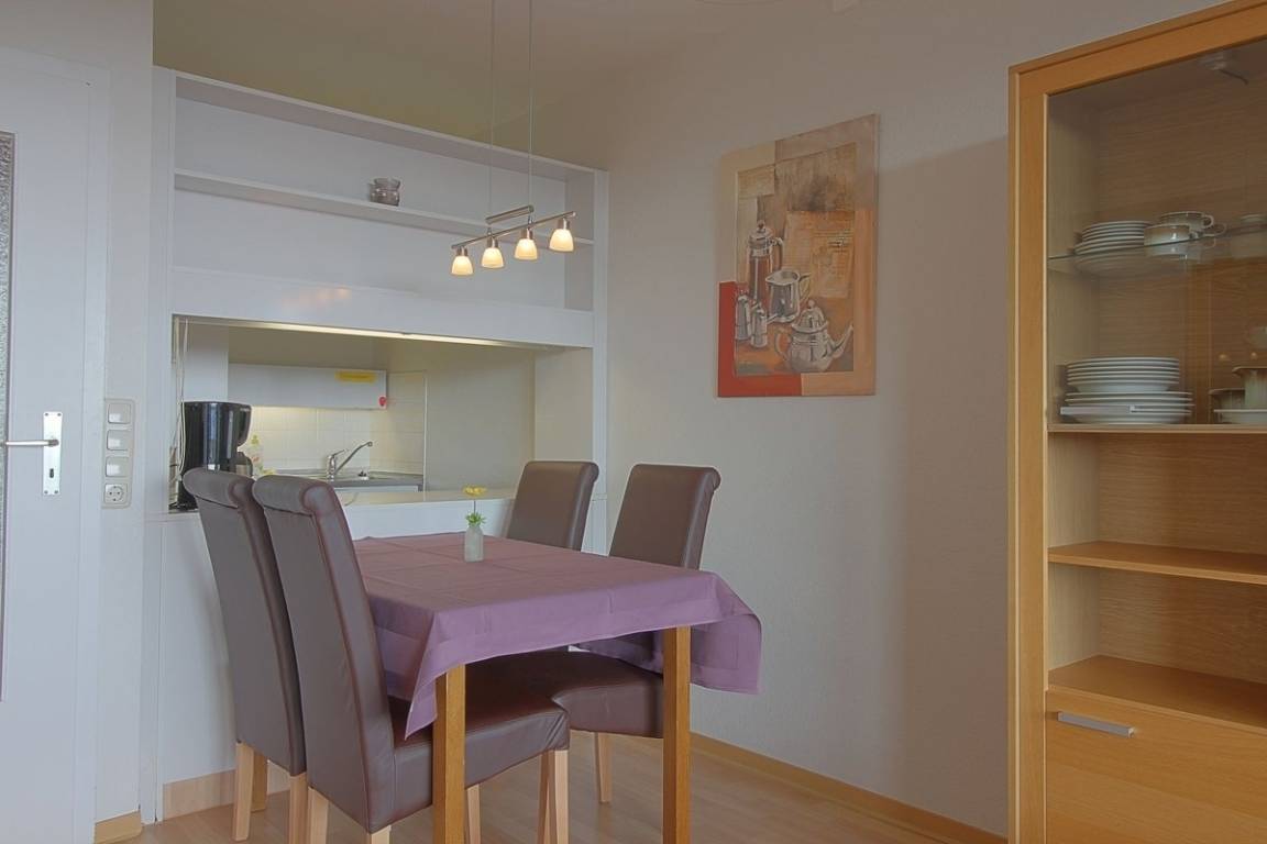 Komfortabel ausgestattete, Nichtraucher- Ferienwohnung mit einem Schlafraum mit Doppelbett (1,80 x 2,00 m) und ein Schlafsofa für die dritte Person im zweiten Schlafraum, Küchenzeile mit Essecke und Wohnraum. Der Wohn-und Schlafbereich ist mit Laminatboden ausgestattet.