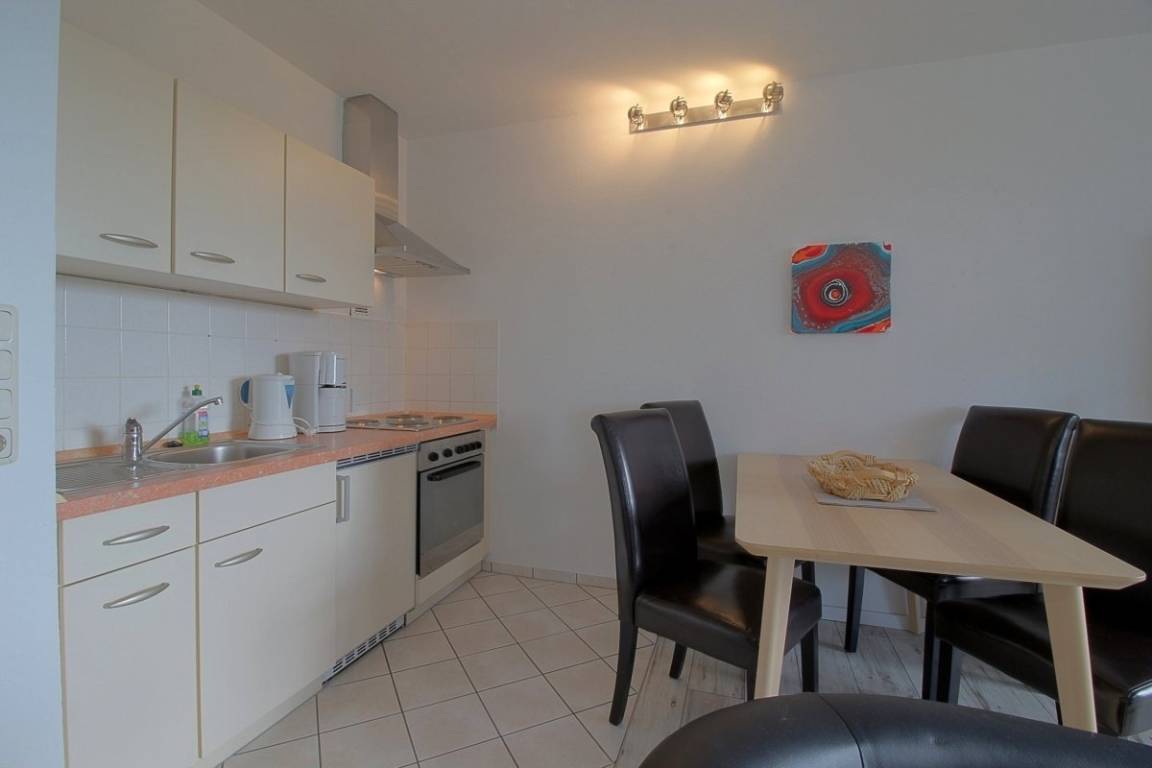 Modern eingerichtete Nichtraucher- Ferienwohnung mit einem Schlafraum mit Einzelbett (0,90 x 2,00 m) und einem Hochbett. Küchenzeile mit Essecke und Wohnraum mit Doppelbett (1,40 x2,00 m). Der Wohn-und Schlafbereich ist mit Laminatboden ausgestattet. Modernisiertes Duschbad, keine Haustiere