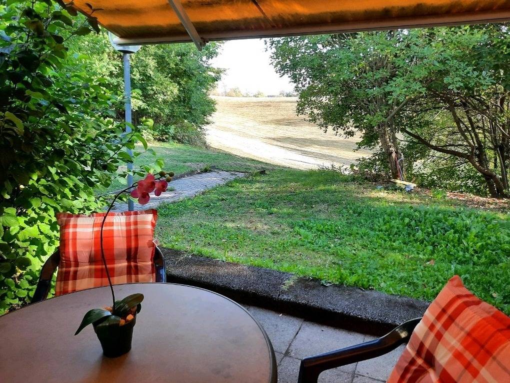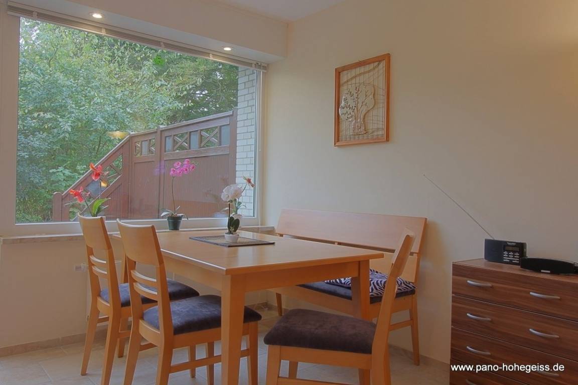 Der tolle Blick in die Natur vom Essbereich aus trägt zur Erholung bei. Die komplette Ferienwohnung ist mit Fliesenboden ausgestattet. Modernes Duschbad mit Fenster.