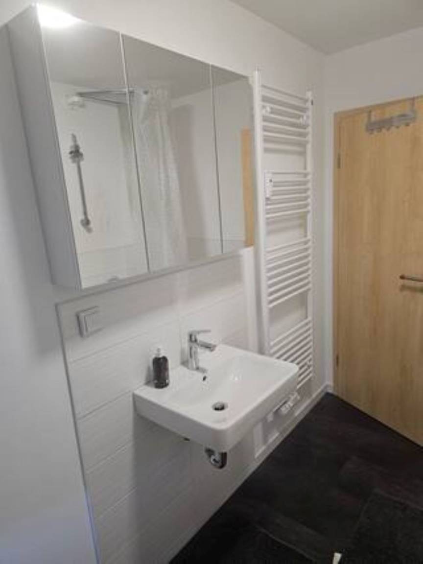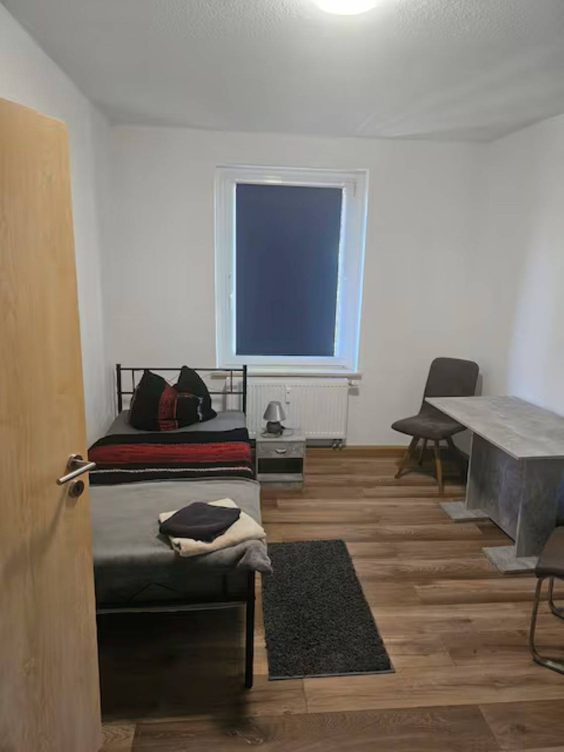 Jedes Zimmer verfügt über 1 oder 2 Einzelbetten 90x200 mit H4 Taschenfederkernmatratze, Kleiderschrank, Nachttischrank mit Nachttischlampe, Schreibtisch + Stuhl, Wäscheständer , Mülleimer. Insgesamt gibt es 3 Schlafzimmer.