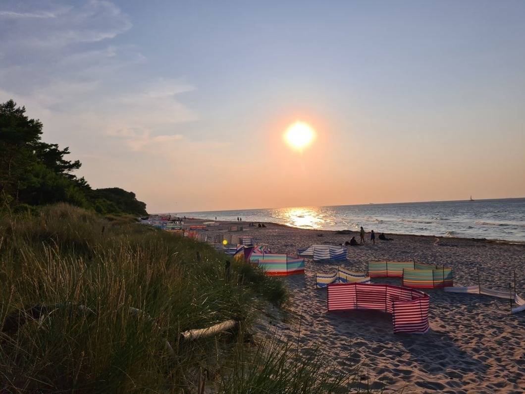 große private Sonnenterrasse Ausrichtung S/O mit Blick auf den Bodden, Strandkorb, Gartenmöbeln und Grill
