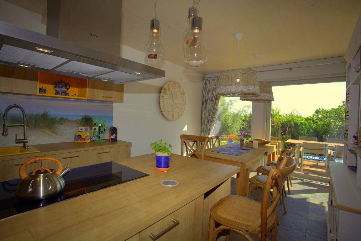 Besonders charismatisch und einladend macht die Arbeit mit Holz und Glas. Das gesamte Haus wurde in Holzrahmenbauweise gefertigt, innen wie außen sind viele Holzelemente sichtbar und geben dem Haus das unverwechselbare individuelle Gesicht. Auf drei Seiten befinden sich riesige bodentiefe Fensterelemente, die das Gebäude mit Sonne durchfluten. Faszinierend ist besonders die Vollverglasung zum Meer hin, mit einem großen Schiebeelement im Erdgeschoß, welches innen und außen verschmelzen lässt. Die wenigen Wände, fehlende Türen und die hohe weiß lasierte Vollholzdecke schaffen den Eindruck einer großen Einheit von Wohn- und Essbereich.