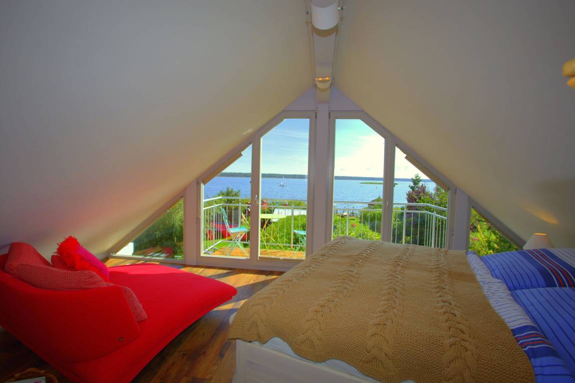 Beim Betreten des Hauses wird man im Flur von einer im Boden eingelassenen, beleuchteten Muschelwelt unter Glas empfangen. Ebenso findet man im Erdgeschoss ein kleines Gästezimmer mit maritimen Bad. Über die großzügige Podesttreppe gelangt man ins Obergeschoß, wo man vom Schlafstudio aus einen großartigen Meerblick genießt und auch gerne beim Rauschen der Wellen mal einnickt. Ein kleiner wasserseitiger Balkon lädt zum Kaffee ein. Gegenüber befindet sich der Wellnessbereich mit bodentiefer Dusche, sprudelndem Whirlpool und einer aufwändig gestalteten Waschzone. Durch die vielen Dachfenster ist auch im Obergeschoß kaum künstliches Licht notwendig.