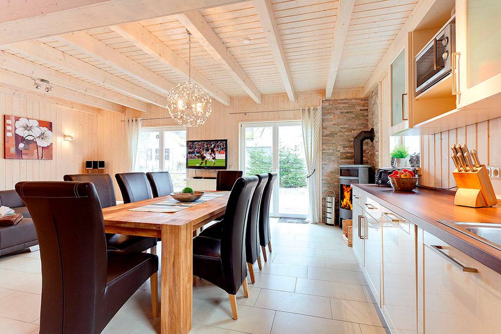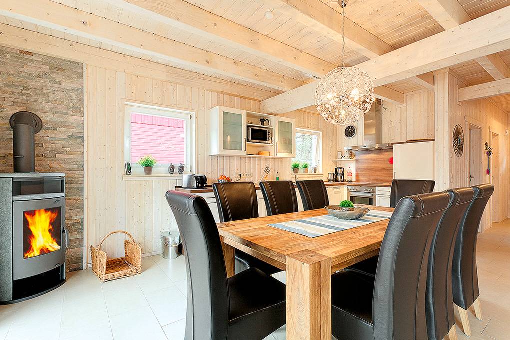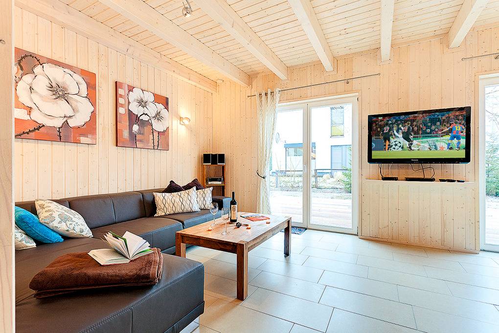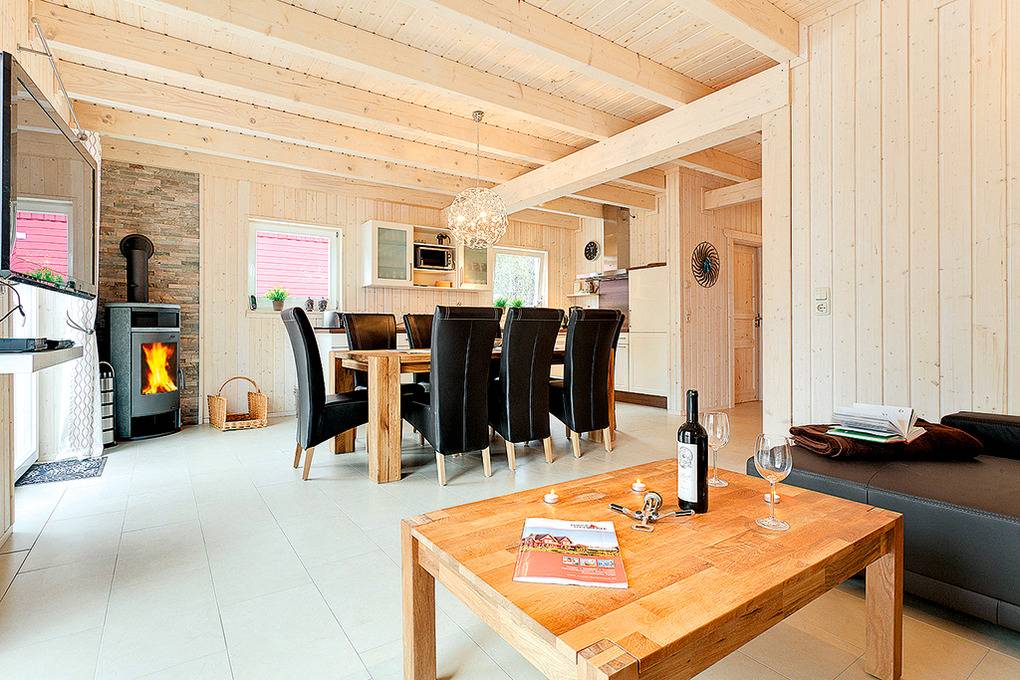 D 121.3 Ferienhaus 2-8 Pers.: Komfortable 6-Zimmerhaushälfte mit 120 qm Wohnfläche. Großzügiger Wohn-/Essraum (28 qm) mit Kaminofen, Couchgarnitur, Flachbild-Sat-TV, DVD, Radio-CD, Esstisch, sehr gut ausgestatteter Einbauküche (Backofen, Mikrowelle, Spülmaschine). Bad: Du, Wb, WC, Waschmaschine. Schöner Saunabereich mit Dusche, Ruheliege. 1. Etage: 4 Doppelzimmer, zwei davon mit Sat-TV. Bad: Du, 2 Wb, WC.