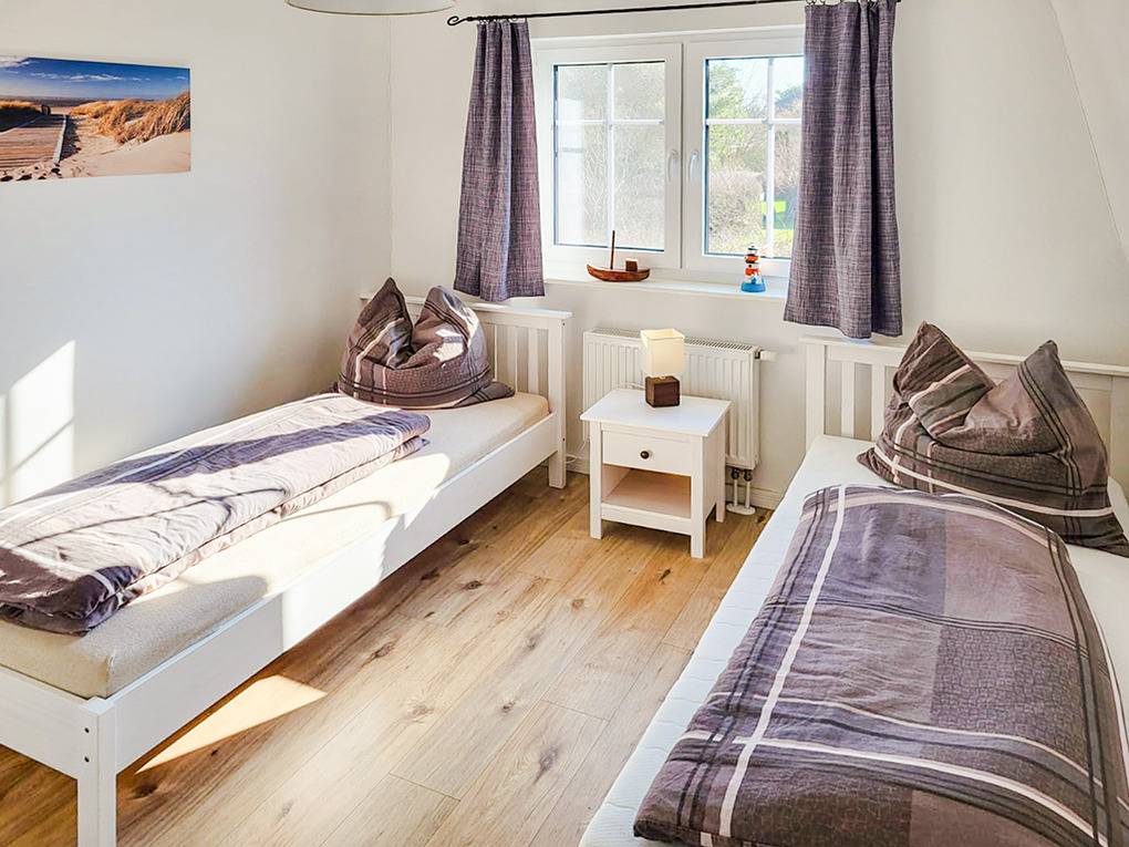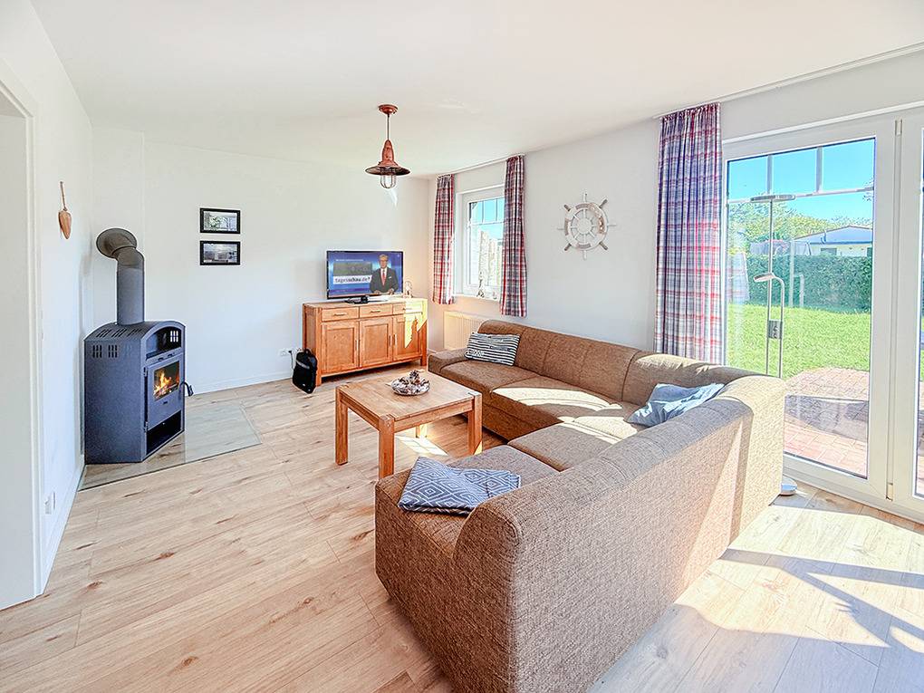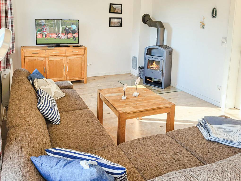 D 122.7 Ferienhaus 2-8 Pers.: Schöne 5-Zimmerhaushälfte mit 120 qm Wohnfläche über 3 Etagen. Parterre: Großzügiger Wohn-/Essraum mit Kaminofen, Couchgarnitur, Smart-TV, Esstisch, gut ausgestatteter Einbauküche (Backofen, Spülmaschine). Bad: Sauna, Du, Wb, WC. Abstellraum mit Waschmaschine. 1. Etage: Zwei Doppelzimmer. 2-Bettzimmer. Bad/WC. 2. Etage (Dachgeschoss mit Schrägen, offen zum Flur): 2-Bettzimmer.