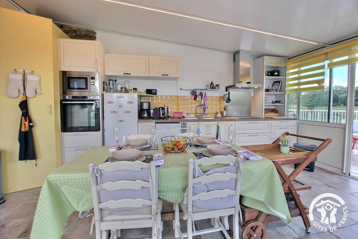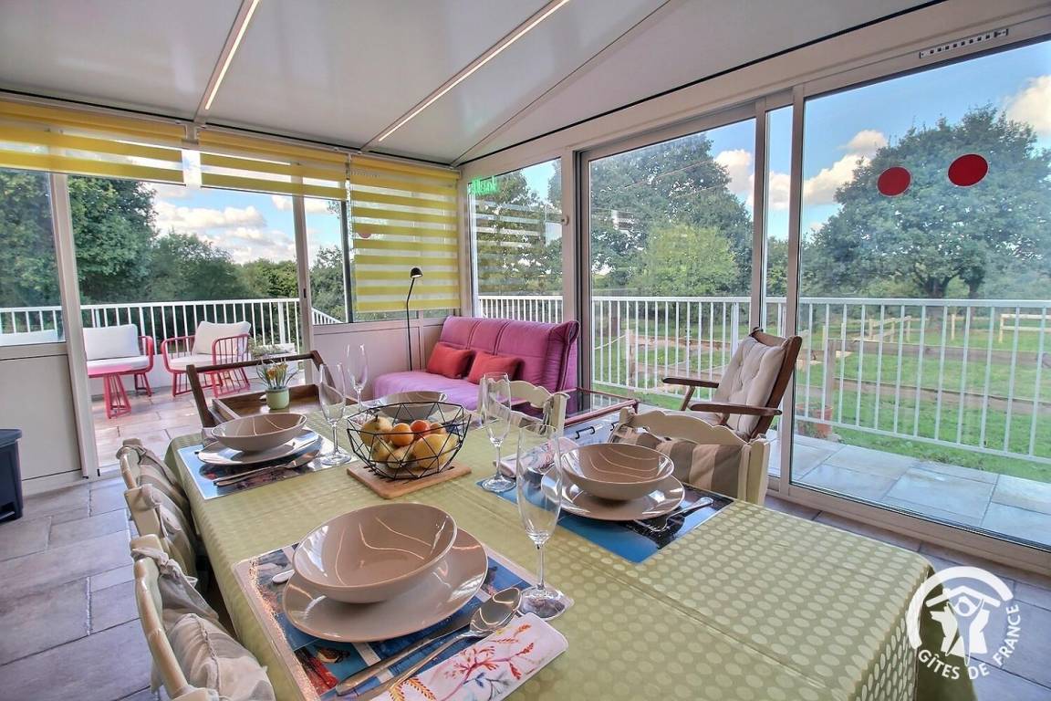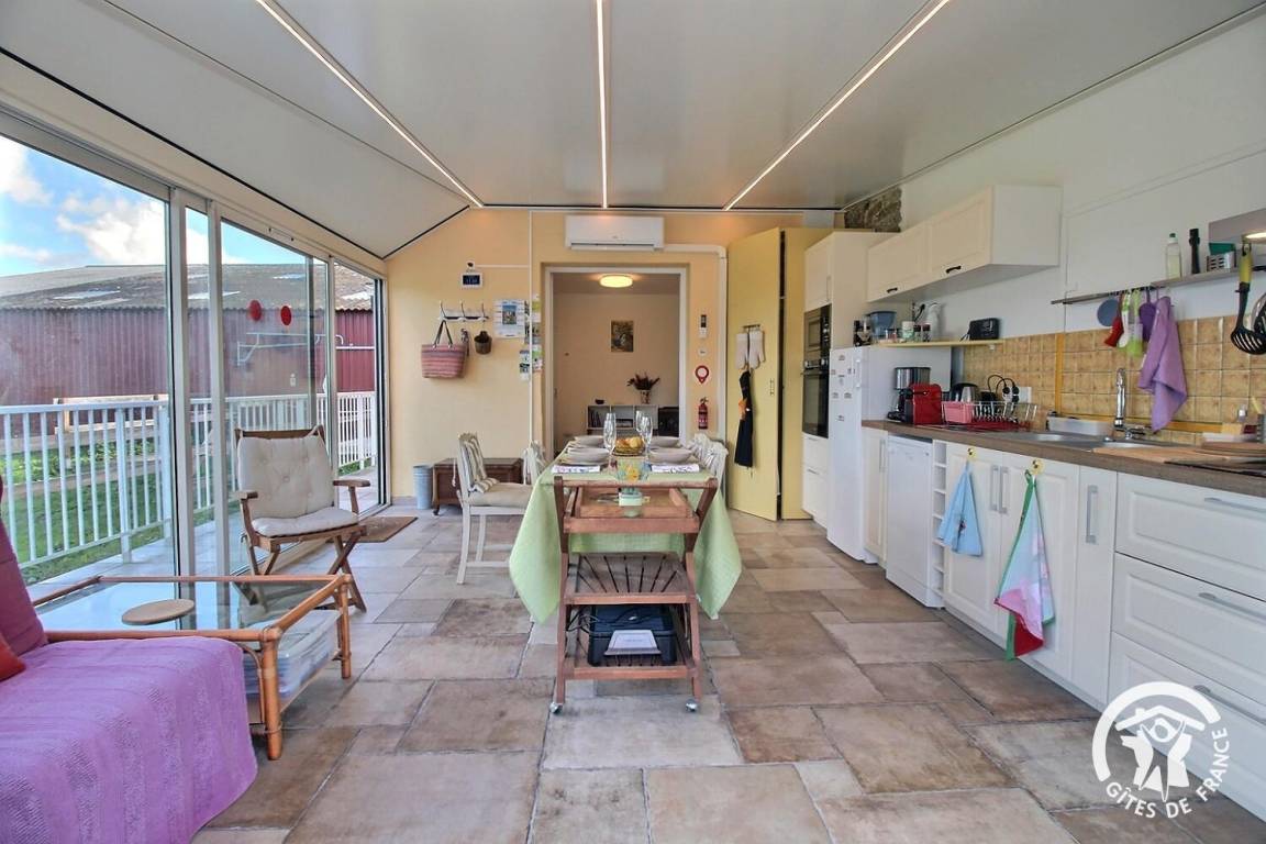 – Eine helle Veranda mit Küche und Essbereich