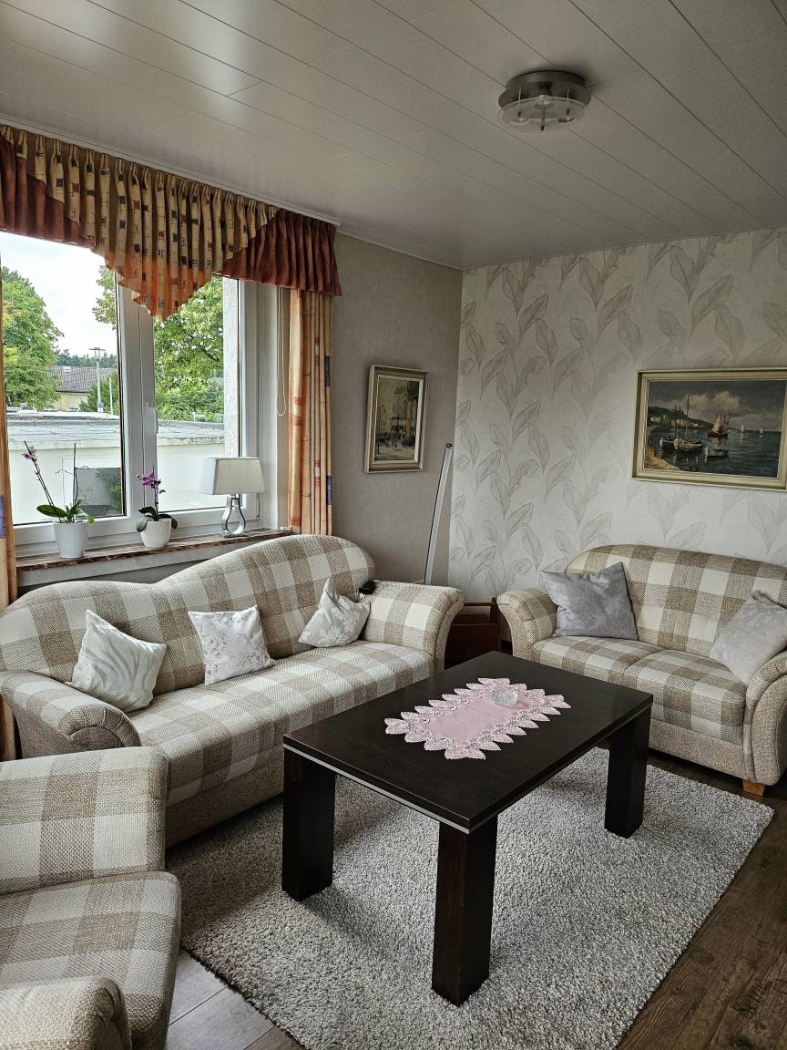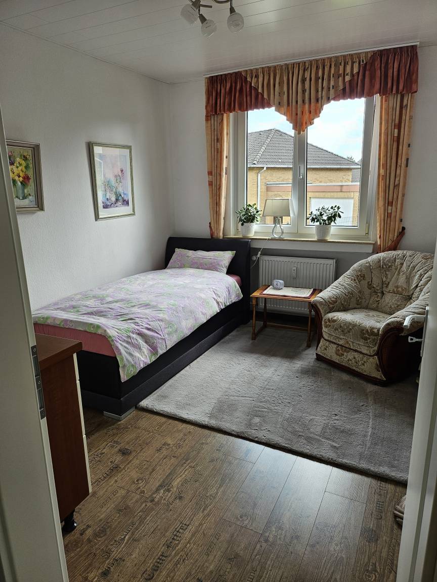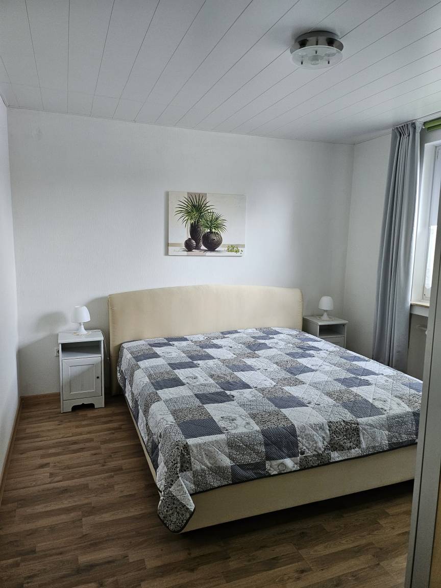 Diese helle und ruhige 3 Zimmer Wohnung befindet sich im Erdgeschoss eines 2 Familienhauses in einer ruhigen Wohngegend. Das Wohnzimmer, mit einer 3er, 2er und Sessel lädt zum Entspannen oder zum Fernsehen ein. Eine Terasse mit Tisch und Stühlen sowie eine Gartenliege ist durch eine Terassentür vom Wohnzimmer aus zu erreichen. Die große vollausgestattete Küche verfügt über einen schönen Essplatz an dem sie ihre Mahlzeiten, einen Kaffee oder Tee genießen können. Das 1. Schlafzimmer ist mit einem Doppelbett von 200x200cm und einem Kleiderschrank ausgestattet. Das 2. Schlafzimmer verfügt über ein Bett 90x200cm Bett sowie einem gemütlichen Sessel mit kleinem Tischchen und einer Vitrine mit 3 Schubladen. Das Badezimmer ist mit einer ebenerdigen Dusche und einem erhöhten WC ausgestattet und verfügt über ein Fenster. Bettwäsche und Handtücher incl.. Parkmöglichkeitenbefinden sich gegenüber vom Haus und für Fahräder haben wir einen Platz in der Garage.
