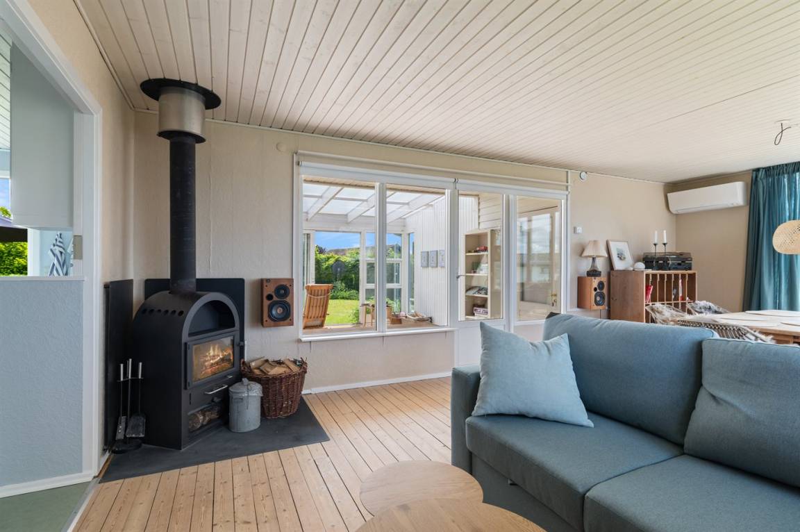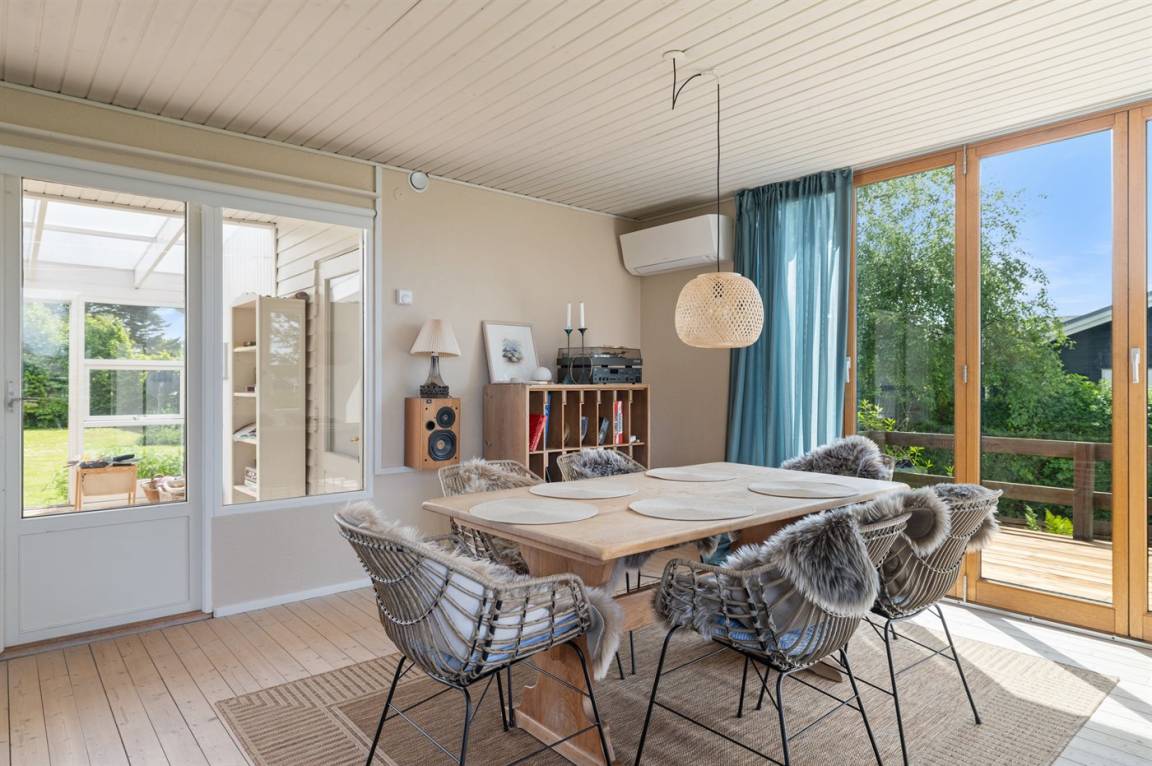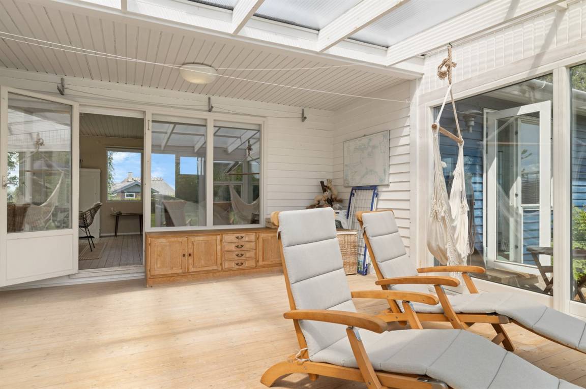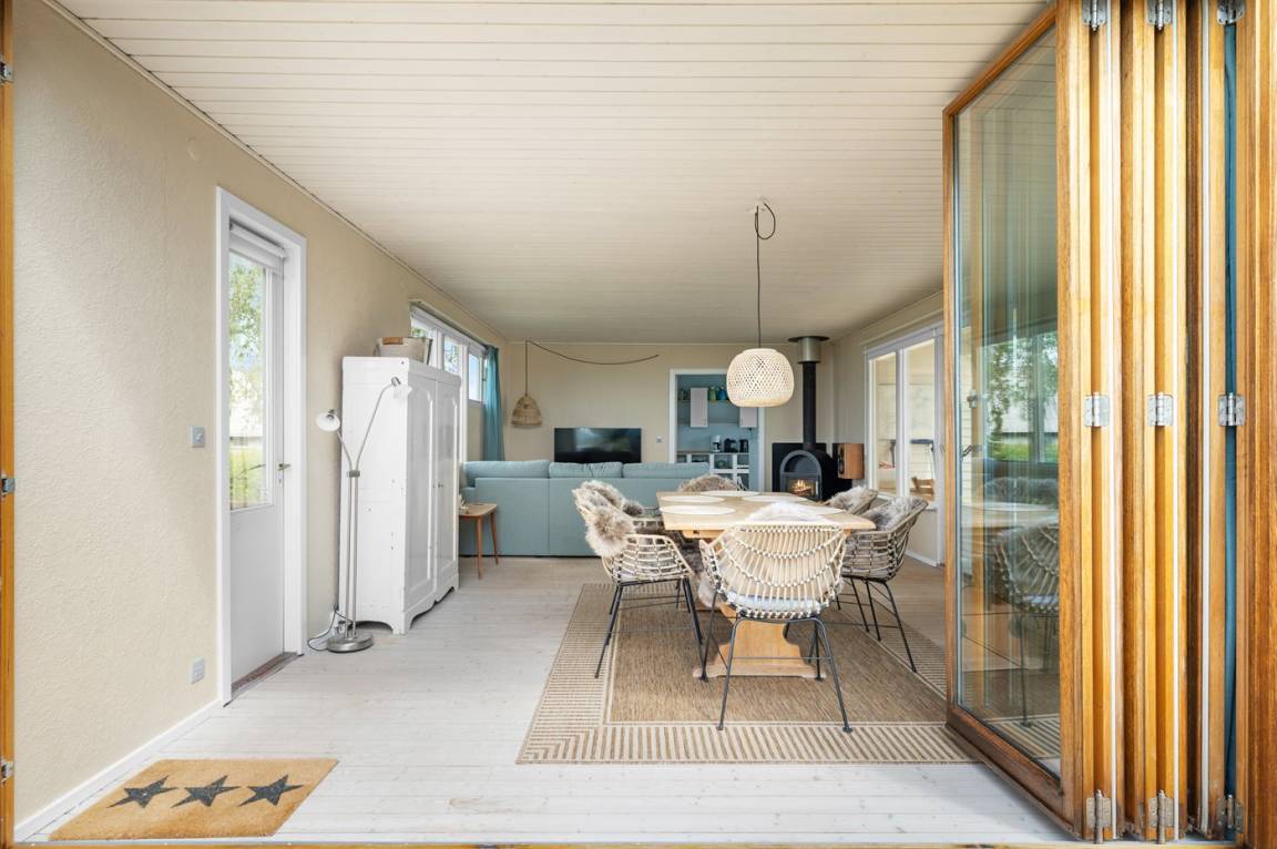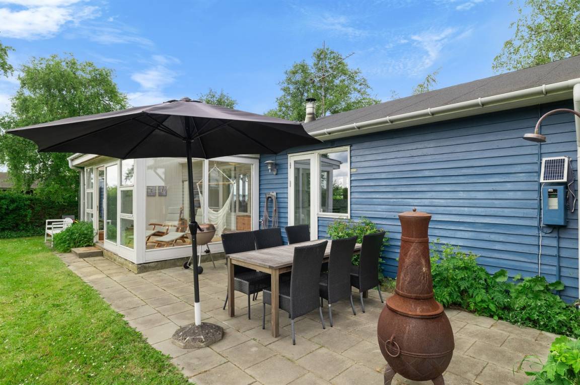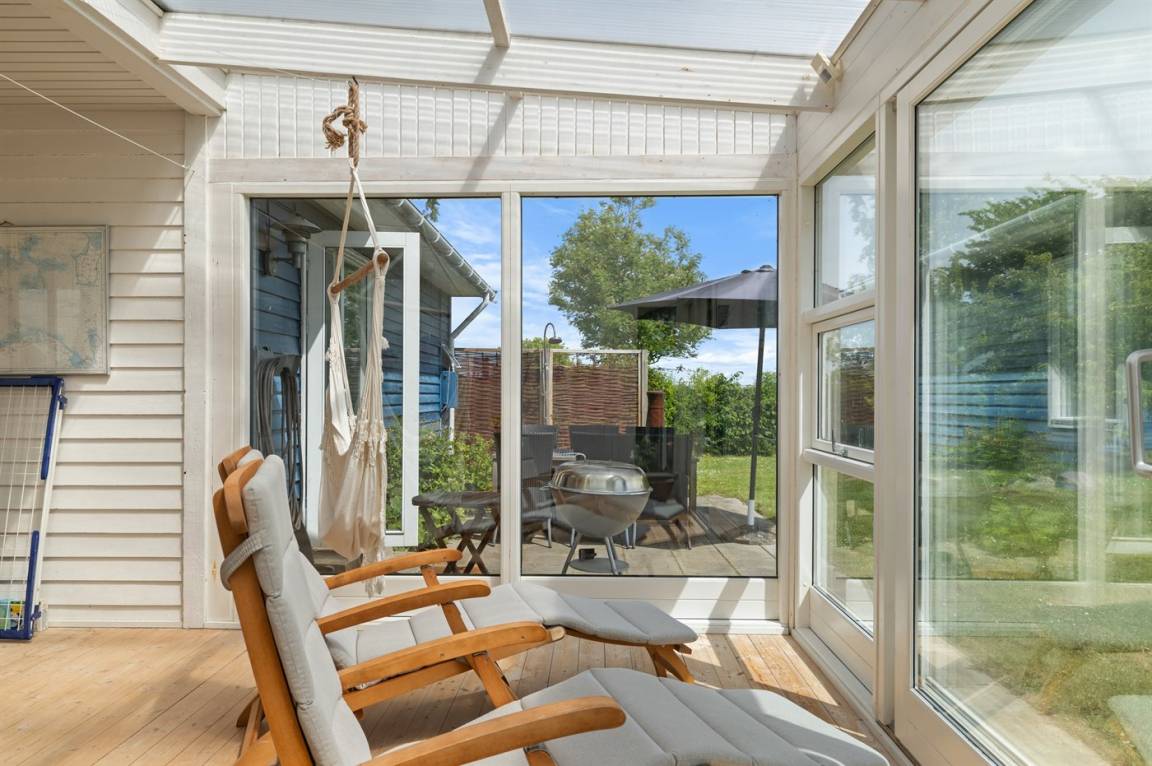 Das Haus ist gemütlich eingerichtet und auf der Rückseite findest du einen schönen Wintergarten – von hier hast du Zugang zur südlich gelegenen Terrasse und zum Garten. Im Garten gibt es viel Platz für Aktivitäten im Freien.