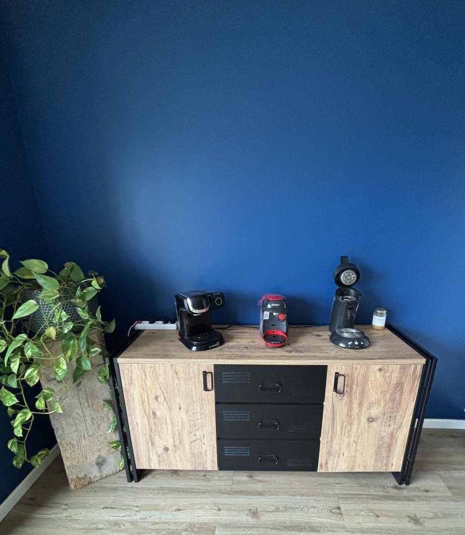 Erdgeschoss: Zum Wohnzimmer offene Küche, Nebengebäude (Bügeleisen, Waschmaschine und Trockner) und ein Badezimmer (Badewanne und Dusche).