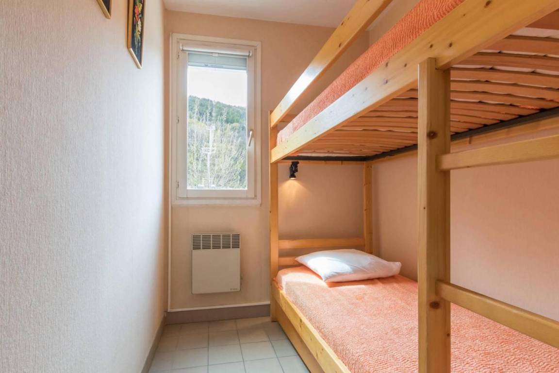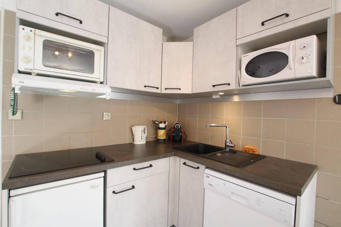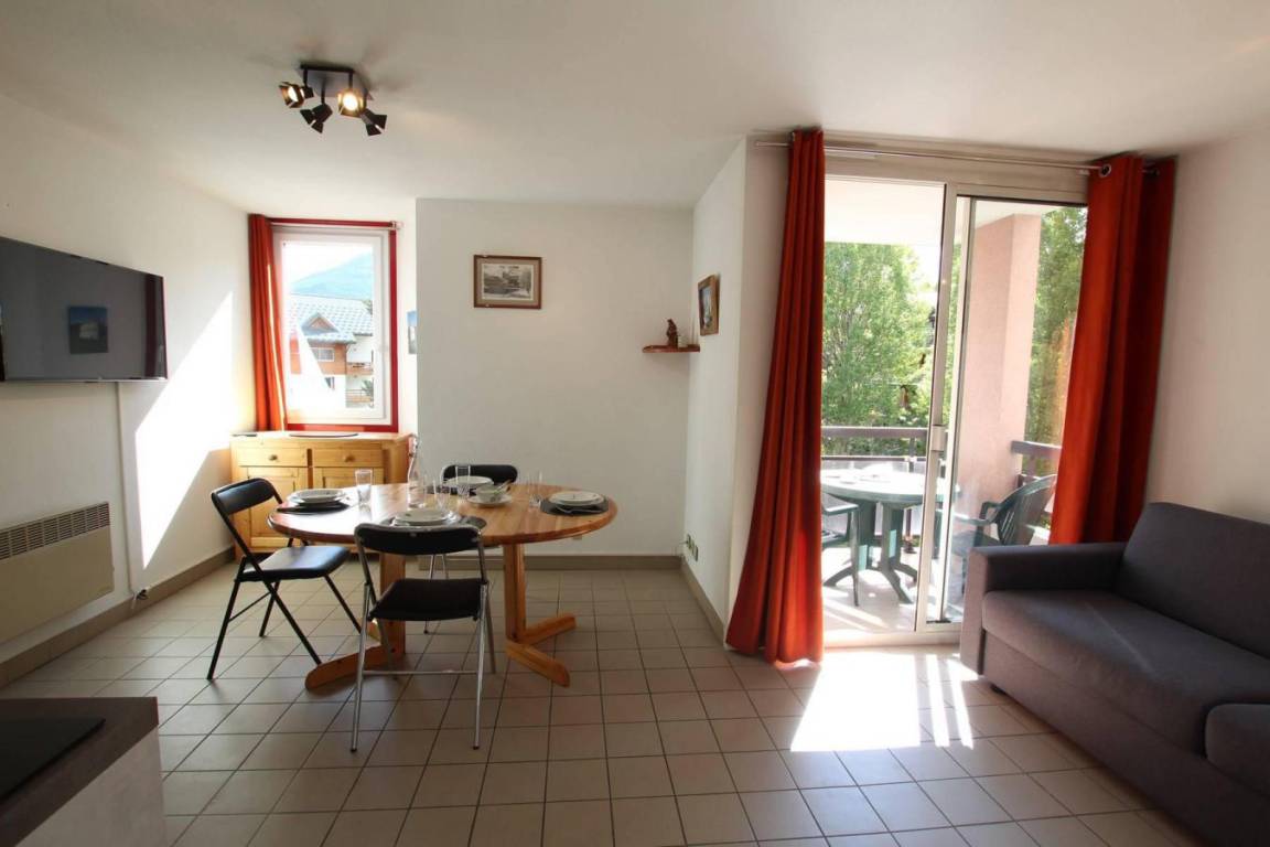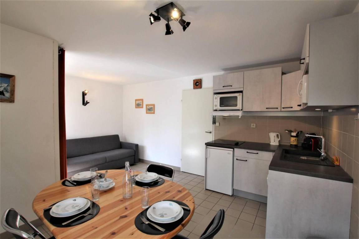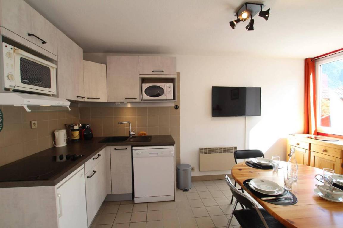 Fläche von ungefähr 38 m². 3te Etage. Orientierung : Süd. Blick berg und Skipisten. Diele mit Skiaufbewahrungsfach. Wohnzimmer mit Sofa. offener Schlafbereich mit 2 Stockbetten. offener Schlafbereich mit Doppelbett. Kochnische mit Wasserkocher, Kaffeemaschine (capsules), kleiner Backofen mit Mikrowellenfunktion, Toaster, Geschirrspülmaschine, 2 Glaskeramikkochfelder, Kühlschrank. Waschräume mit Dusche. separates WC. Balkon. Die oberen Betten sind nicht für Kinder unter 6 Jahren geeignet.