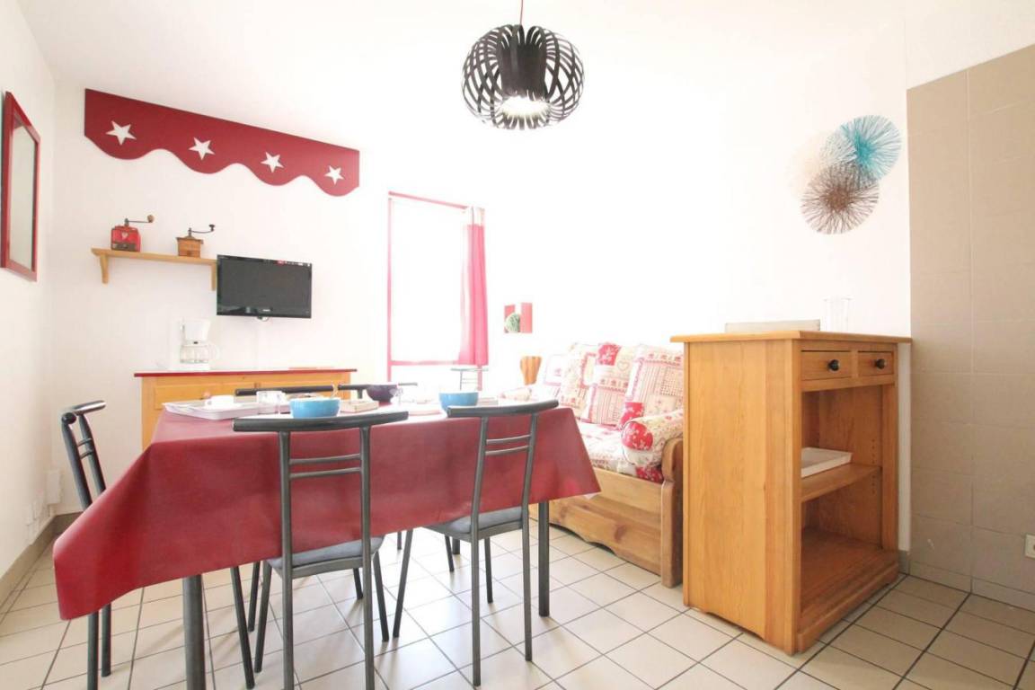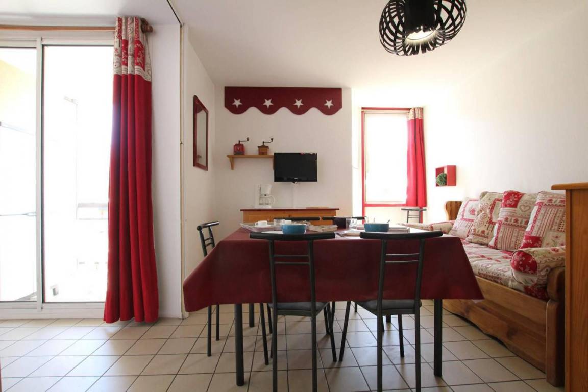 Fläche von ungefähr 30 m². 4te Etage. Orientierung : Süd. Blick berg. Wohnzimmer mit 2 Ausziehbetten. offener Schlafbereich mit 2 Stockbetten. Schlafzimmer mit Doppelbett, Vorhang zum schließen. Küche mit Kaffeemaschine (filtres), Backofen, kleiner Backofen mit Mikrowellenfunktion, Geschirrspülmaschine, 4 Herdplatten, Kühlschrank. Badezimmer mit Badewanne. WC. Balkon. Die oberen Betten sind nicht für Kinder unter 6 Jahren geeignet.