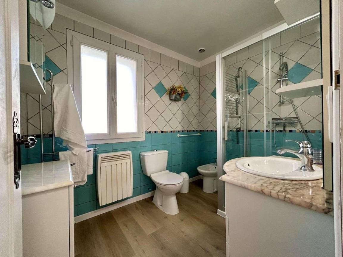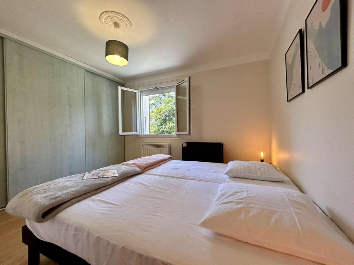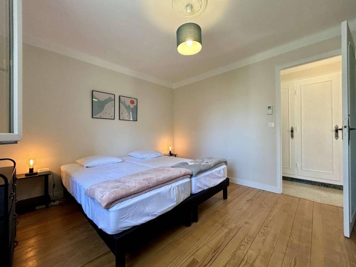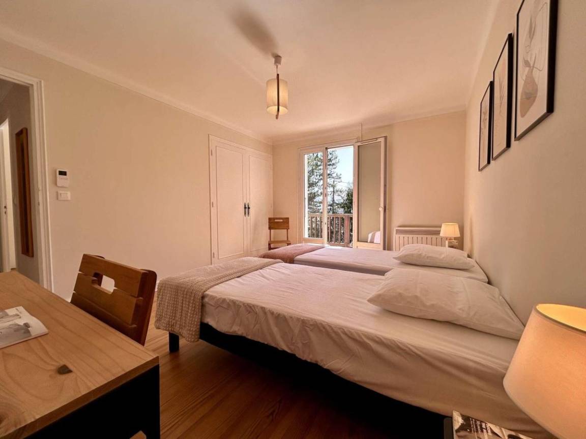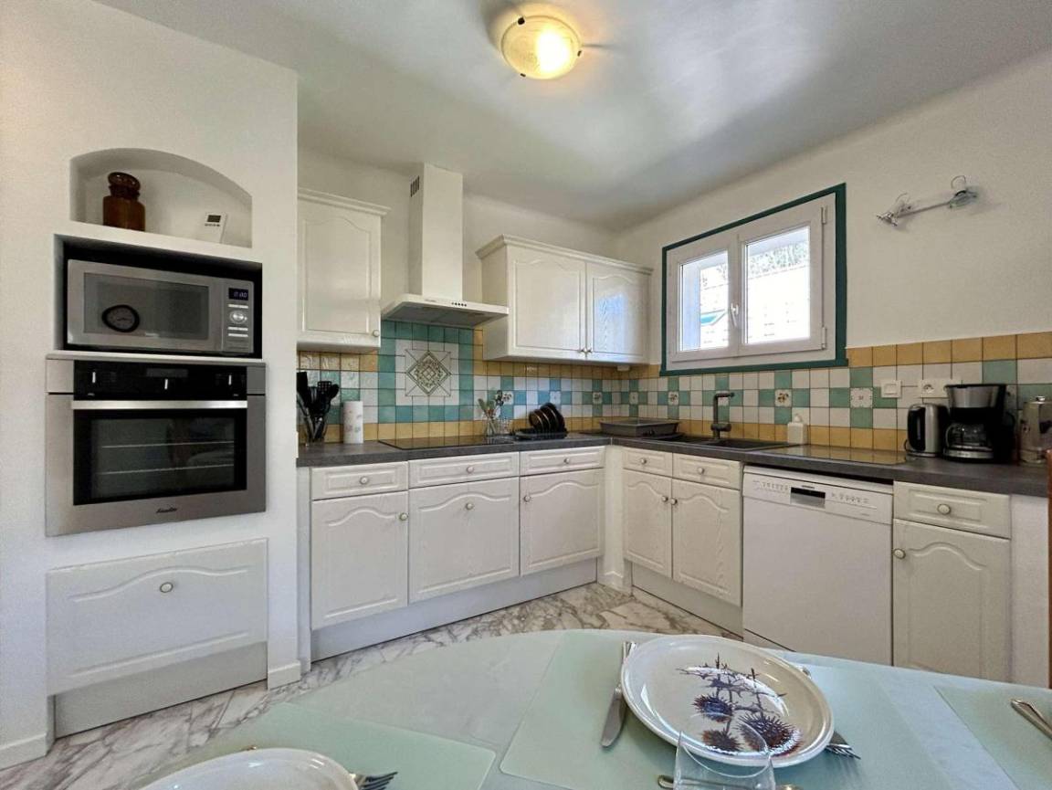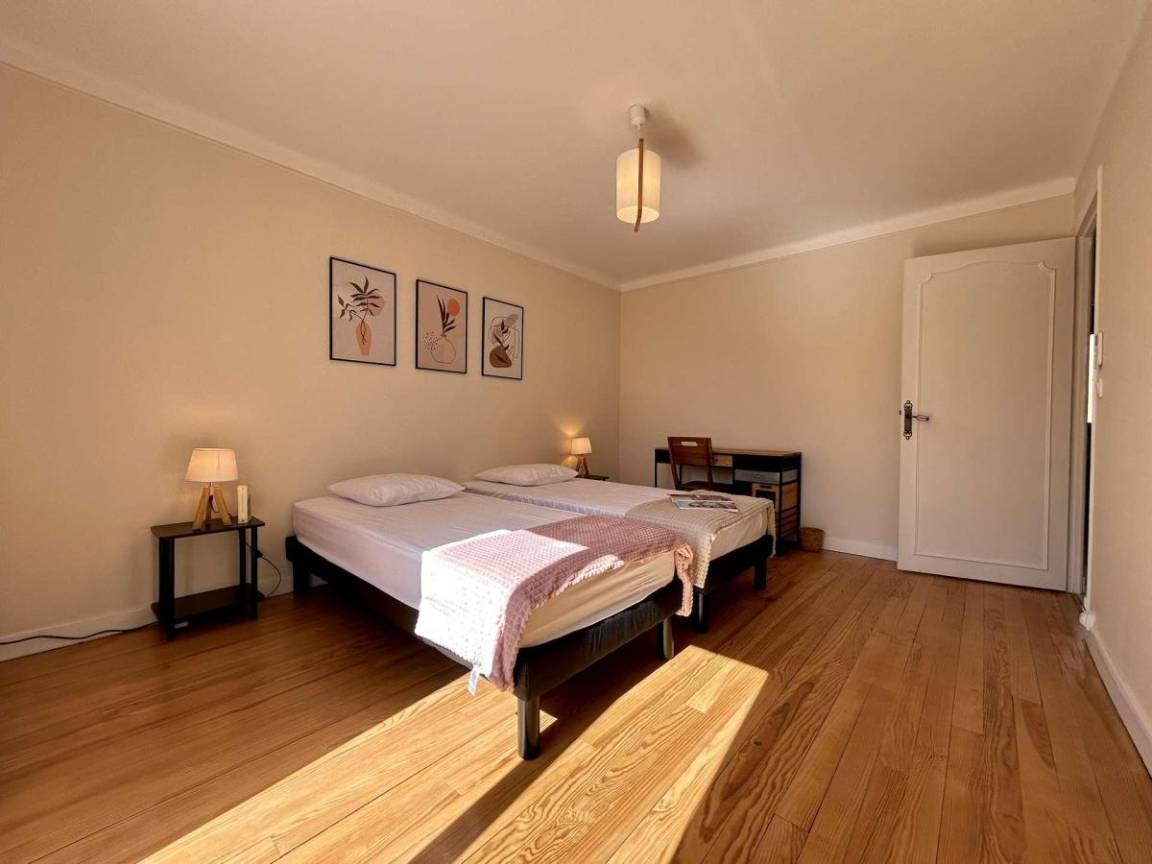 Fläche von ungefähr 125 m². 1te Etage. Orientierung : Süd. Wohnzimmer. 2 Schlafzimmer mit 2 Einzelbetten (90x200). Schlafzimmer mit Doppelbett (160x190). Küche mit Wasserkocher, Kaffeemaschine (filtres), Backofen, kleiner Backofen mit Mikrowellenfunktion, Toaster, Geschirrspülmaschine, Induktionsherdplatten, Kühl-Gefrier-Kombination. Waschküche mit Staubsauger, Waschmaschine. Waschräume mit Dusche, WC. Waschräume mit Dusche. separates WC. Balkon.