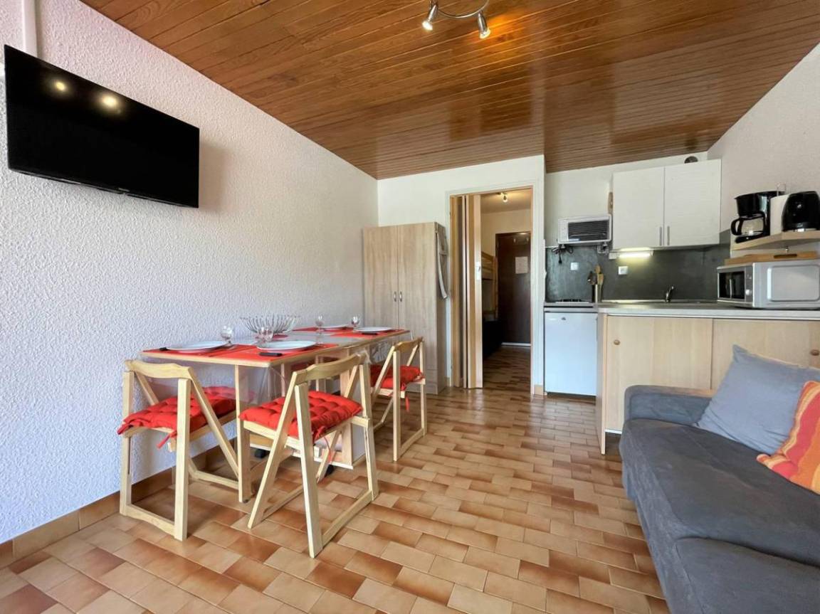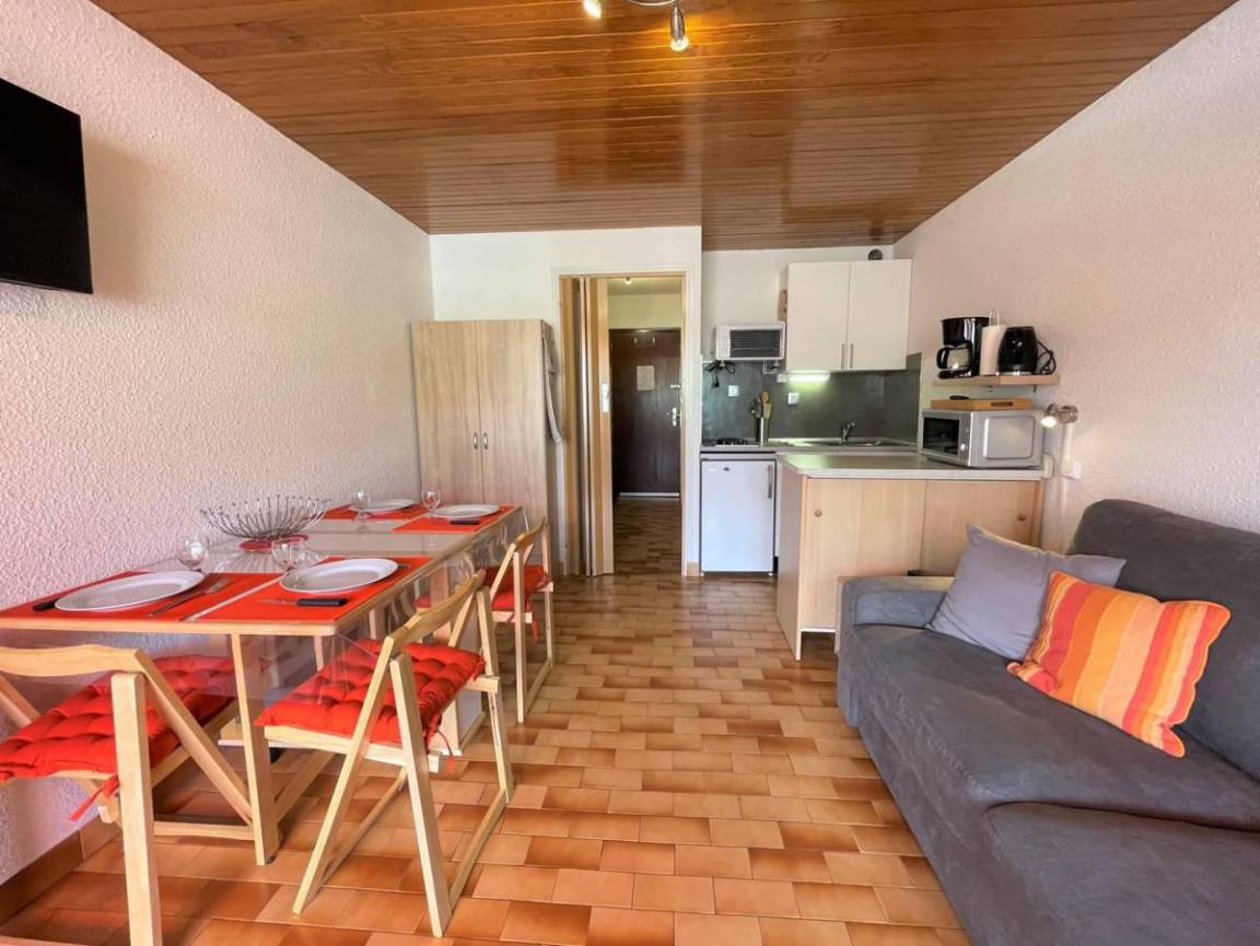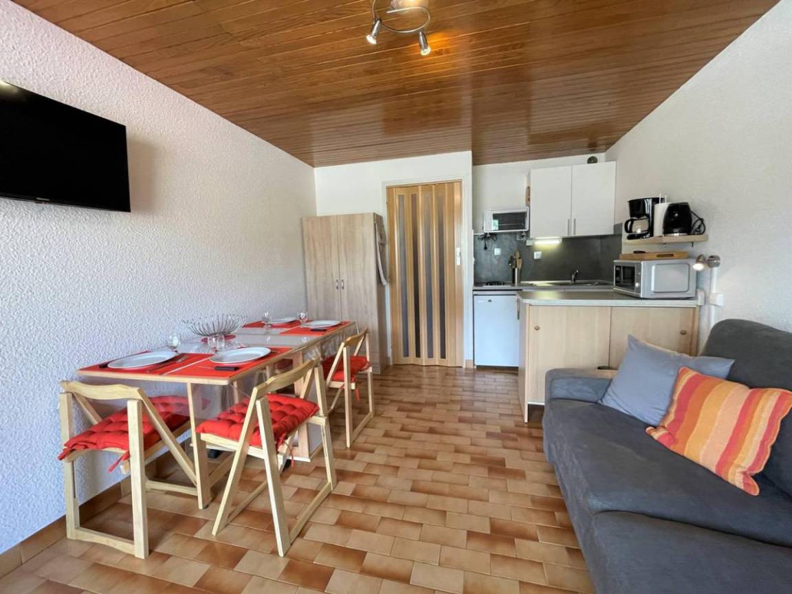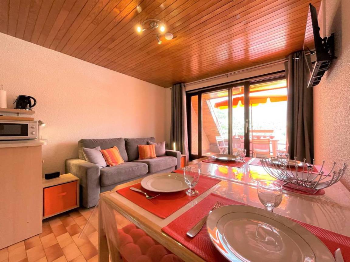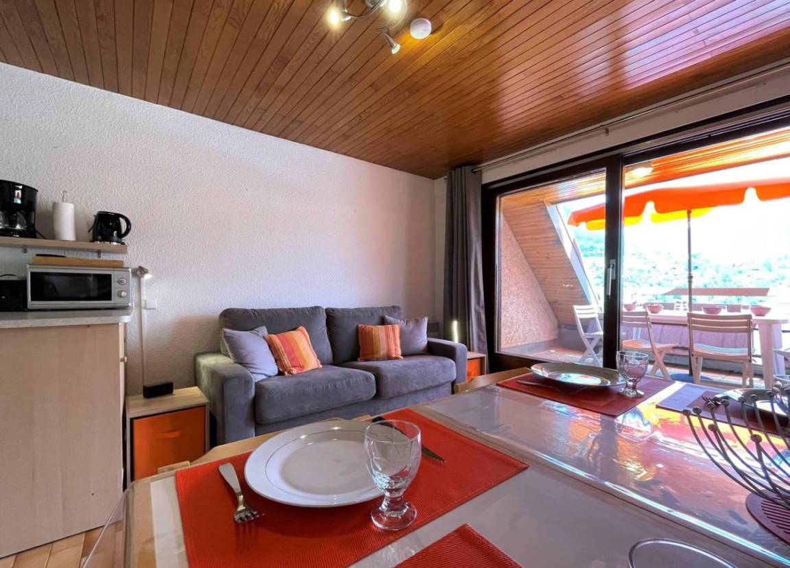 Fläche von ungefähr 26 m². 1te Etage. Orientierung : Ost. Blick panorama. Wohnzimmer mit Klappschlafcouch. offener Schlafbereich mit BZ-Sofas, einfaches Mezzanine Bett. Kochnische mit Raclettegerät, Wasserkocher, Kaffeemaschine (filtres), Backofen, Toaster, Geschirrspülmaschine, Mikrowellenherd, 2 Glaskeramikkochfelder, Kühlschrank. Badezimmer mit Badewanne. separates WC. Balkon mit Gartentisch und -stühle.