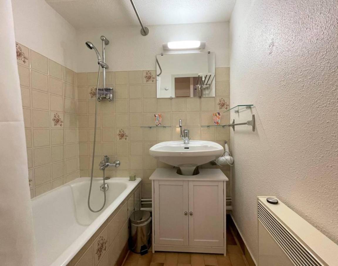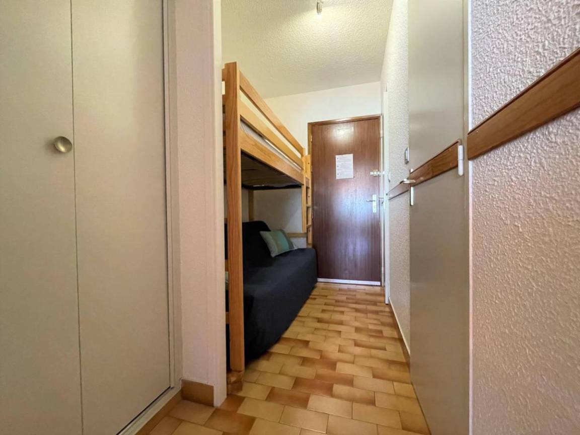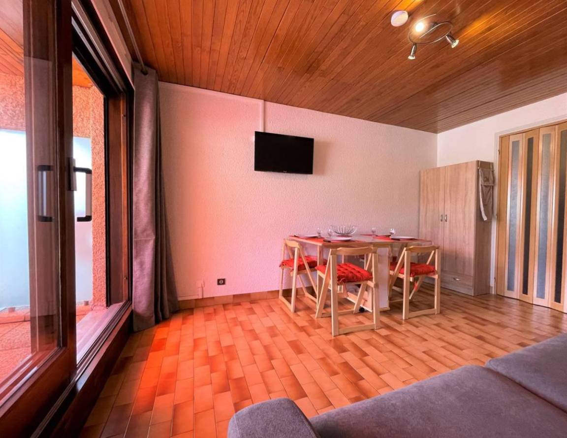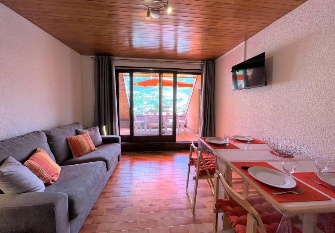 Fläche von ungefähr 26 m². 1te Etage. Orientierung : Ost. Blick panorama. Wohnzimmer mit Klappschlafcouch. offener Schlafbereich mit BZ-Sofas, einfaches Mezzanine Bett. Kochnische mit Raclettegerät, Wasserkocher, Kaffeemaschine (filtres), Backofen, Toaster, Geschirrspülmaschine, Mikrowellenherd, 2 Glaskeramikkochfelder, Kühlschrank. Badezimmer mit Badewanne. separates WC. Balkon mit Gartentisch und -stühle.