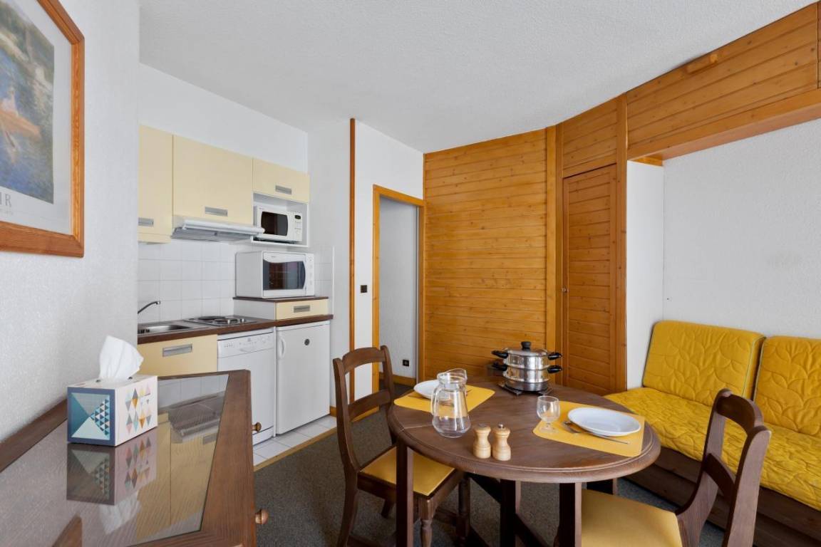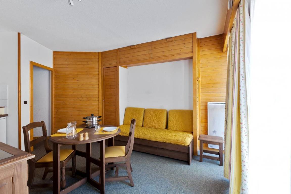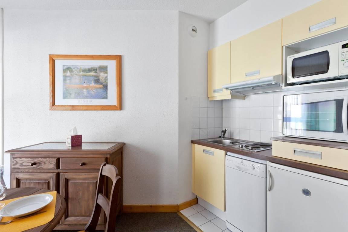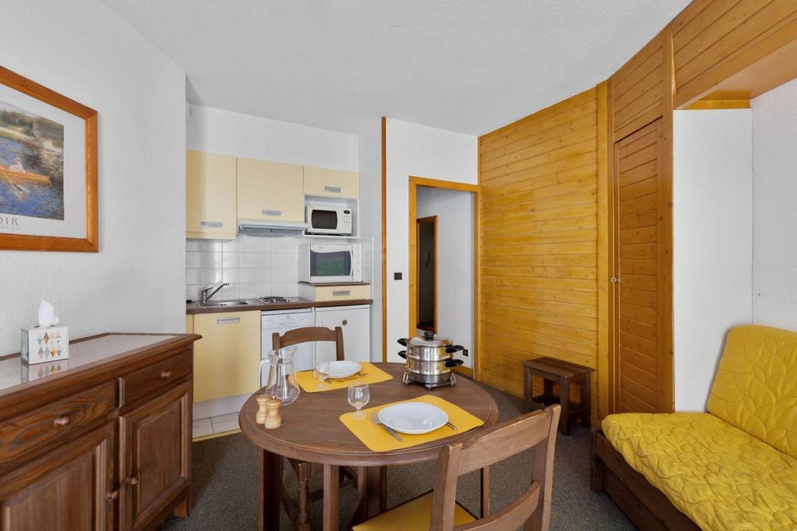 Die Residence Tarentaise befindet sich im Dorf Brides Les Bains, einem kleinen Dorf auf 600 m Höhe, das über die Seilbahn Olympe (Fahrtzeit 30 Minuten) mit Méribel und dem Skigebiet Trois Vallées verbunden ist. Die Seilbahn ist nur 200 m von der Residence entfernt und das Dorfzentrum mit seinen Geschäften und anderen Annehmlichkeiten liegt 100 m entfernt. Fläche von ungefähr 30 m². 1te Etage. Orientierung : Nord. Wohnzimmer mit 2 Ausziehbetten (80). offener Schlafbereich mit Doppelbett (140*190). Kochnische mit Backofen, Geschirrspülmaschine, Mikrowellenherd, Glaskeramikkochfelder, Kühl-Gefrier-Kombination. Badezimmer mit Badewanne, WC.