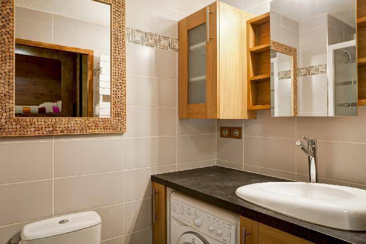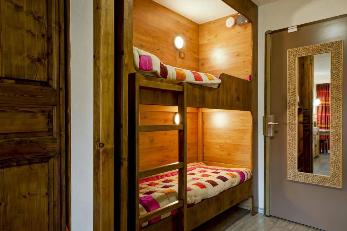 Fläche von ungefähr 28 m². 3te Etage. Orientierung : Ost, Süd. Blick berg. Wohnzimmer mit DVD-Spieler, Doppelbett (160 x 200). offener Schlafbereich mit 2 Stockbetten mit Schiebetür. Kochnische mit Backofen, Dunstabzugshaube, Mikrowellenherd, 4 Induktionsherdplatten, Kühlschrank. Waschräume mit Dusche, Waschmaschine, WC. Balkon. Bügelbrett und Bügeleisen. Die oberen Betten sind nicht für Kinder unter 6 Jahren geeignet.