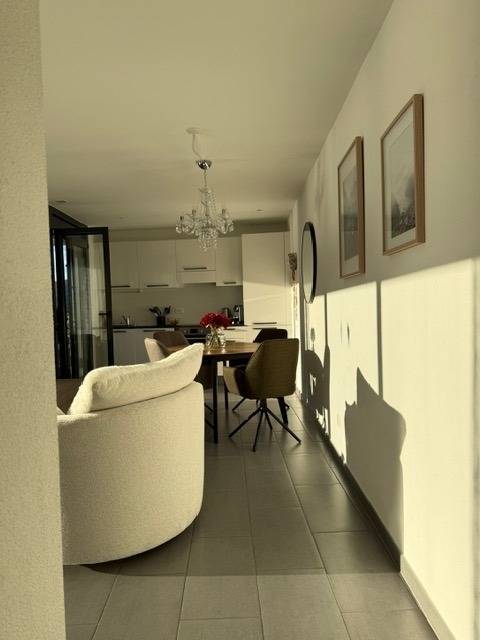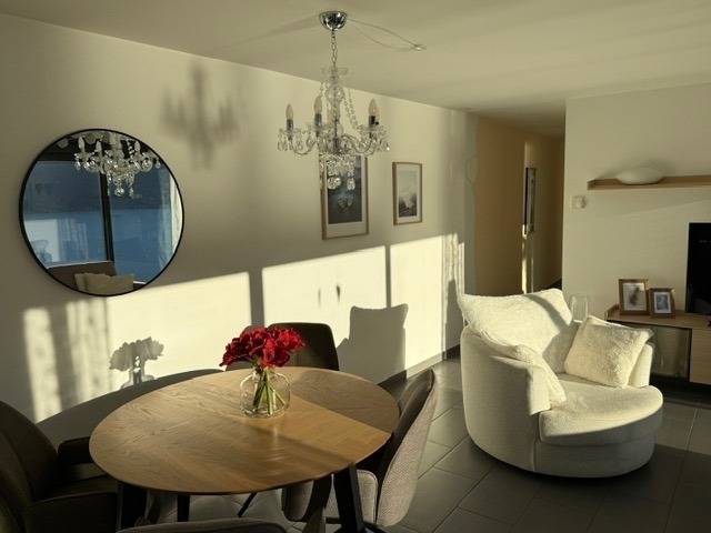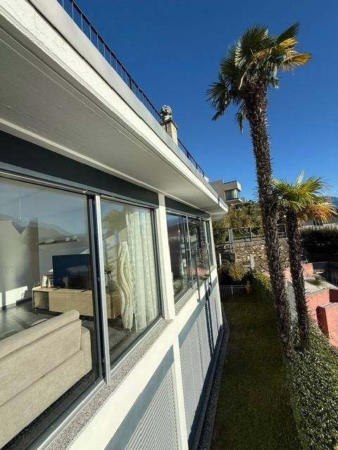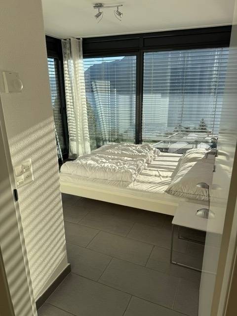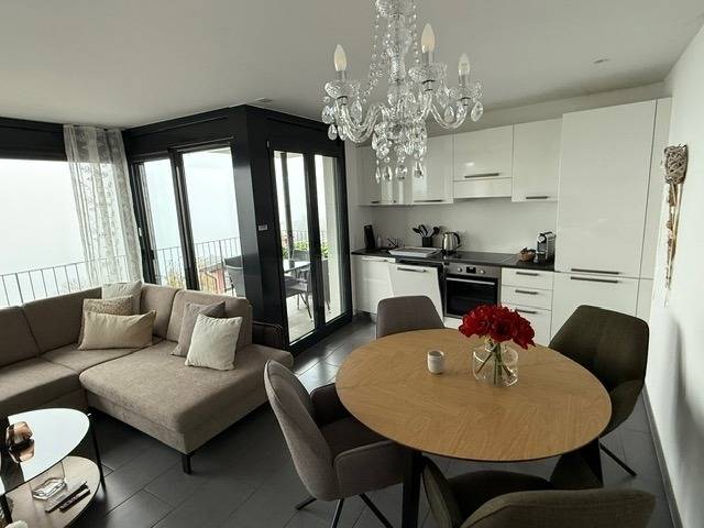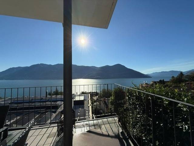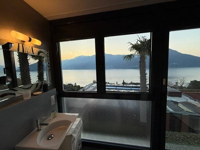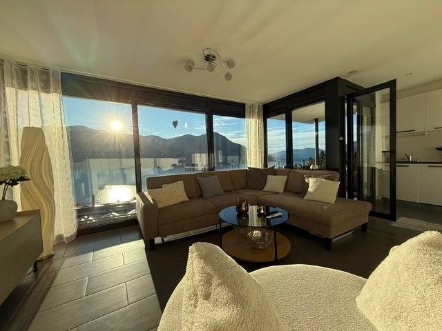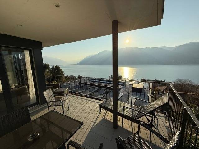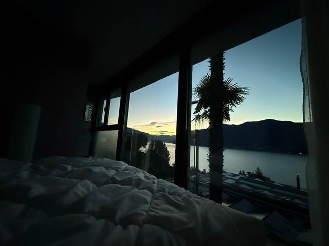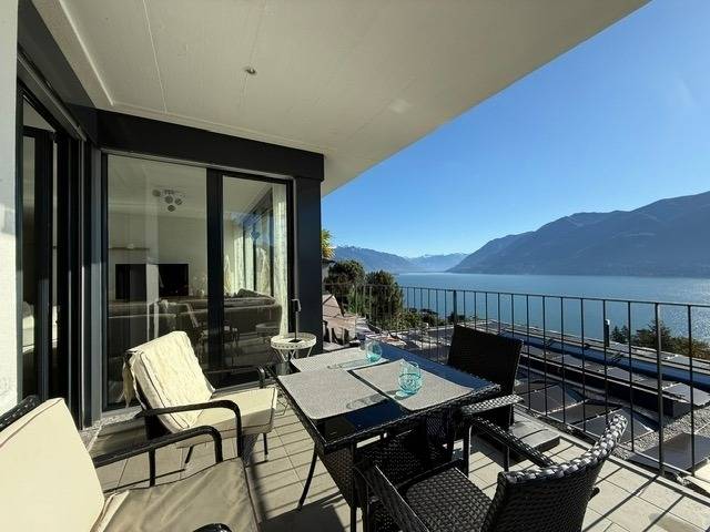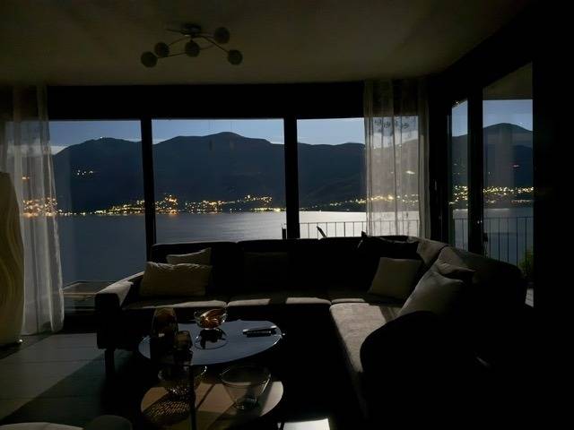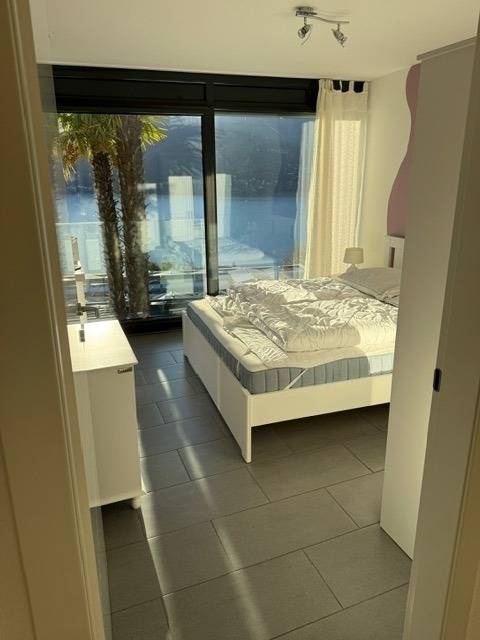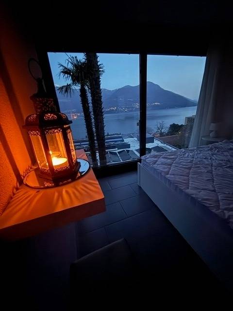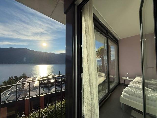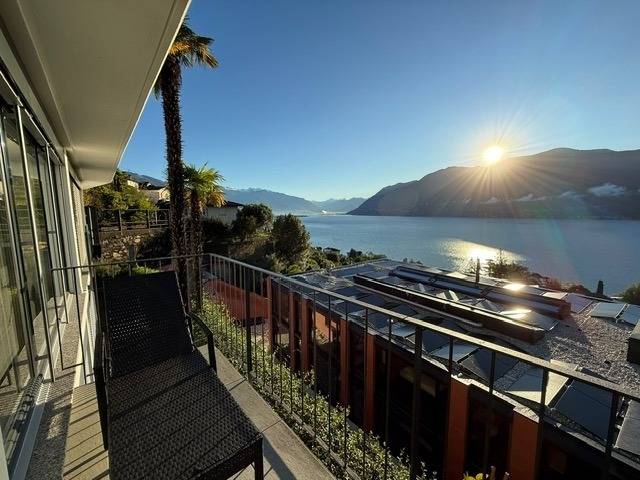 Egal, wo Sie sich in diesem elegant in Beige und Schwarz gestalteten Appartement befinden - ob Sie in der offenen Küche das Essen zubereiten, am Esstisch ein Glas Tessiner Wein genießen, den Abend in der anschließenden Sofaecke ausklingen lassen oder sich in eines der beiden Schlafzimmer zurückziehen - Sie haben immer einen atemberaubenden Blick auf den See und das gegenüberliegende Bergpanorama. Große bodentiefe Fenster gewähren Ihnen einmalige Ausblicke - aus jeder Perspektive. Und was gibt es Schöneres, als am nächsten Morgen auf der lichtdurchfluteten Terrasse in bequemen Rattan-Stühlen den Tag zu begrüßen.