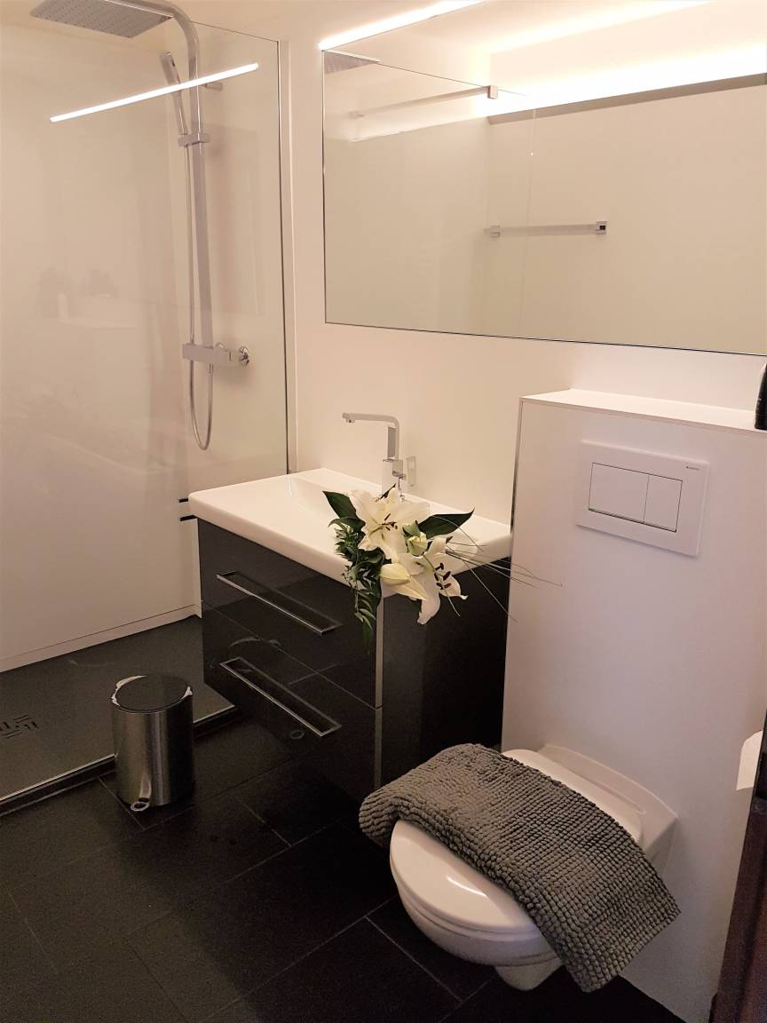 In der unteren Ebene haben Sie neben einem modernen Badezimmer mit Dusche zwei Schlafzimmer zu Ihrer Verfügung: Das eine mit Doppelbett und wunderbarer Seesicht von der vorliegenden Veranda, das andere mit einem komfortablen 120x200 cm großen Bett.