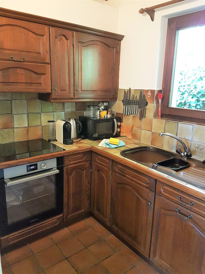Über ein paar Stufen erreichen Sie die obere Ebene, wo Sie ein schön geschnittenes Wohnzimmer mit Essbereich sowie eine gut ausgestattete Küchenzeile sowie ein modernes Gäste-WC erwarten. Der großzügige Wohnraum überzeugt mit Tessiner Charme aufgrund der hohen Decke mit Holzbalken sowie einem offenen Kamin.