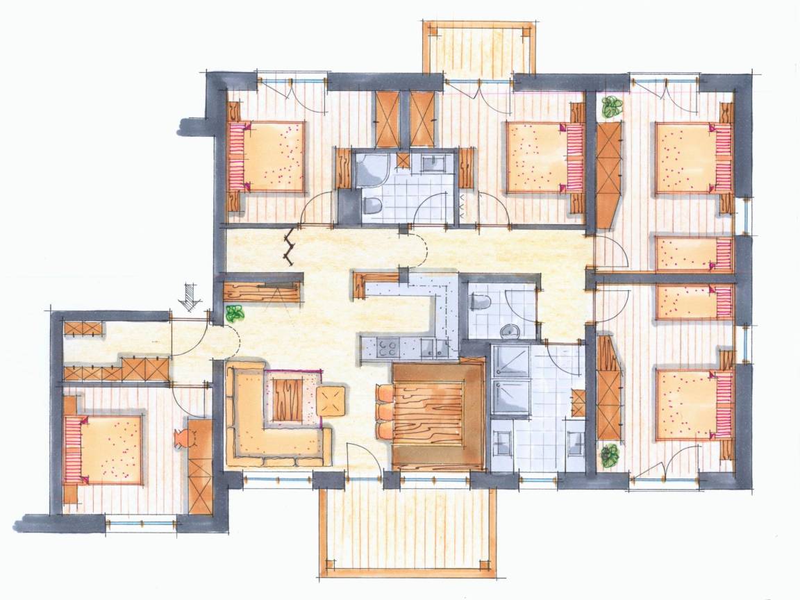 Layout : In der 1. Etage: offene Küche mit Kochplatte(4 Kochplatten, Induktion), Wasserkocher, Toaster, Dunstabzugshaube, 2x Kaffeemaschine(Filter), Backofen, Mikrowelle, Geschirrspüler, Kühl-/Gefrierkombination , Wohn/Esszimmer mit TV, Esstisch(12 Personen), Sitzecke , 3x Schlafzimmer mit Doppelbett(180 x 200 cm), TV , 2x Schlafzimmer mit Einzelbett(90 x 200 cm), Doppelbett(180 x 200 cm), TV , Badezimmer mit 2x Waschbecken, 2x Dusche , Badezimmer mit Waschbecken, Dusche, Toilette , Toilette mit Waschbecken