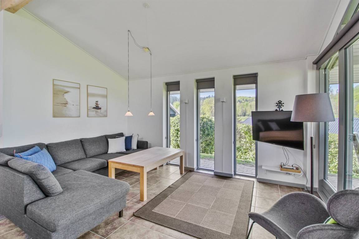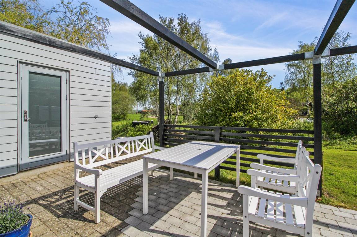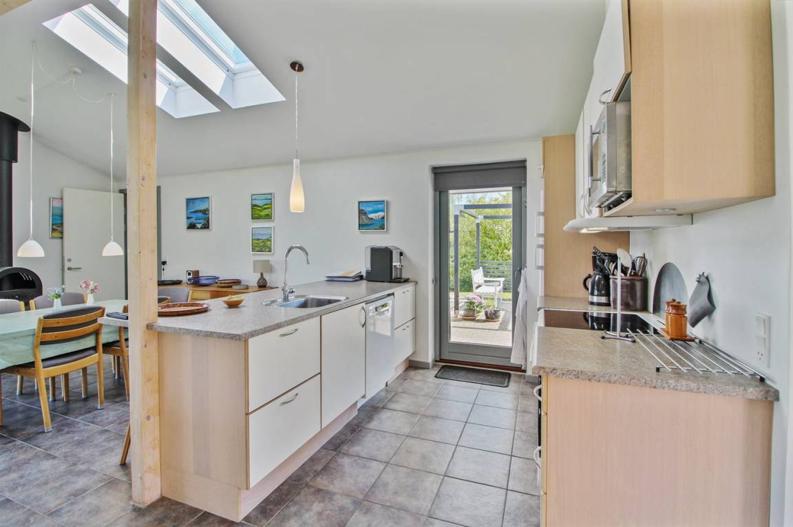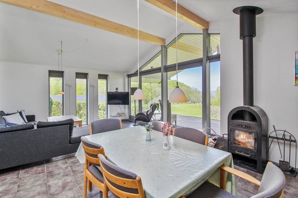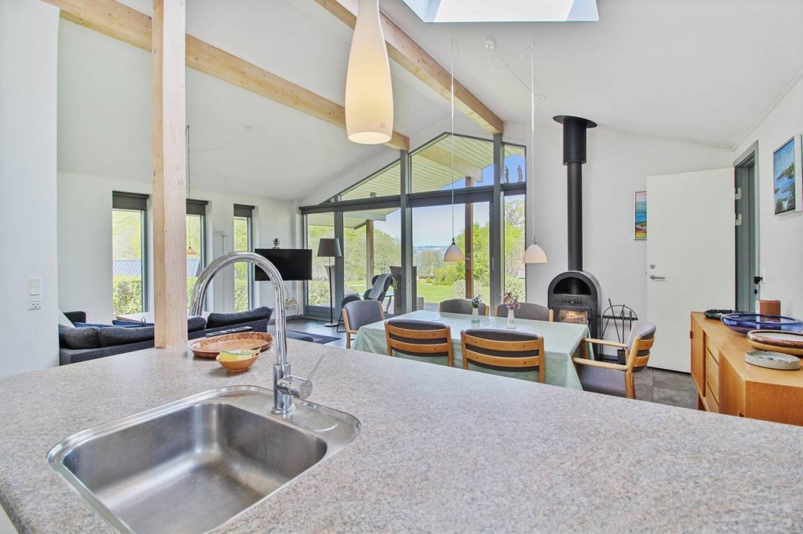DraußenDie Ferienunterkunft liegt auf einem 600 m² großen Naturgrundstück. Die Entfernung zum Fjord beträgt 250 m. Es gibt einen Badesteg in der Nähe. Die nächste Einkaufsmöglichkeit liegt 4000 m entfernt. Es steht ein 40 m² Terrassenareal zur Verfügung. Außerdem gibt es 21 m² überdachte Terrasse. Geräteraum. Außenspüle. Außen-Reinigungstisch. Parkplatz auf dem Grundstück.