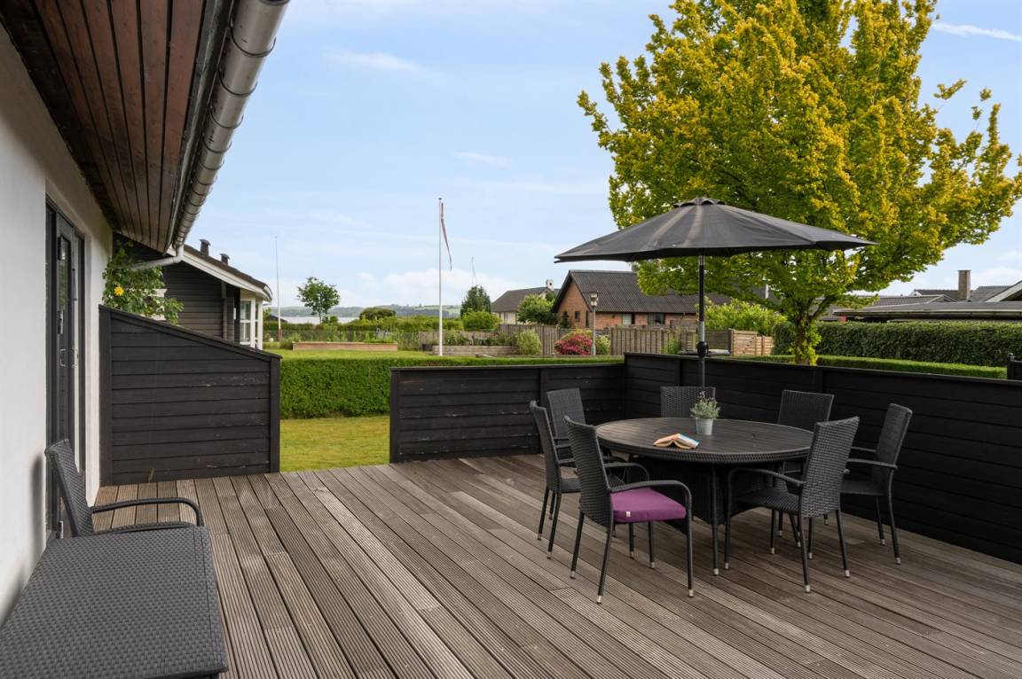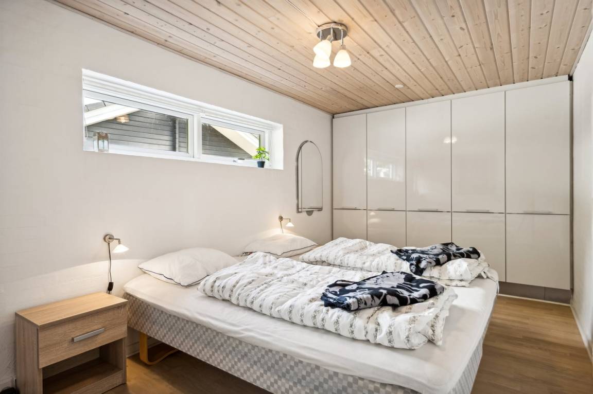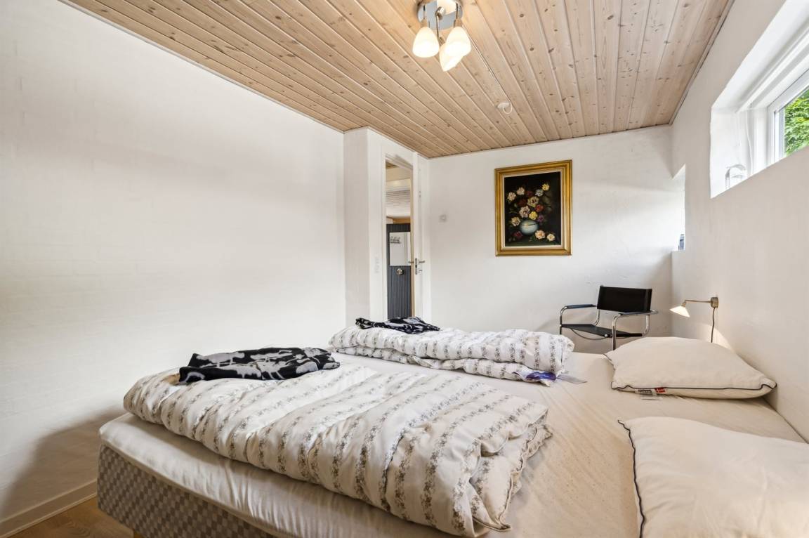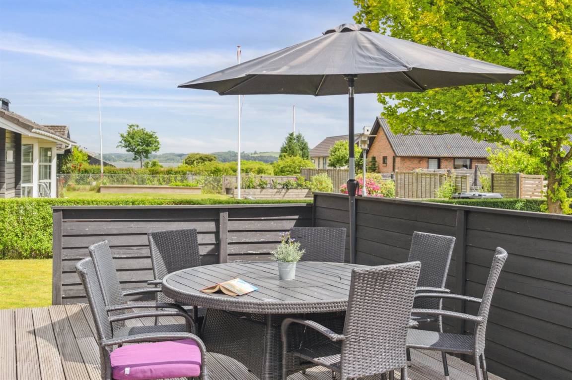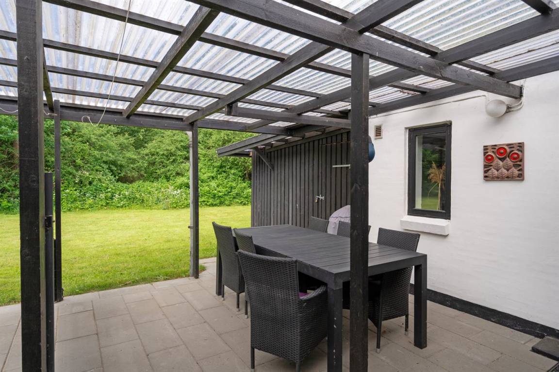 Das Haus verfügt über eine wirklich schöne Terrasse mit Gartenmöbeln und 2 Sonnenliegen, auf der man die wunderschöne Aussicht auf das Wasser in vollen Zügen genießen kann, und auf der anderen Seite des Hauses gibt es eine weitere schöne Terrasse, die überdacht und völlig ungestört ist, da das Grundstück an den Wald grenzt. Hier kann man die Stille in vollen Zügen genießen, und es gibt immer die Möglichkeit, einen geschützten Platz zu finden. Das Feriengebiet lädt zu Spaziergängen in der schönen Natur ein, und ein besonderes Erlebnis ist ein Besuch der Hvidbjerg Düne, die 7 Kilometer vom Haus entfernt liegt.