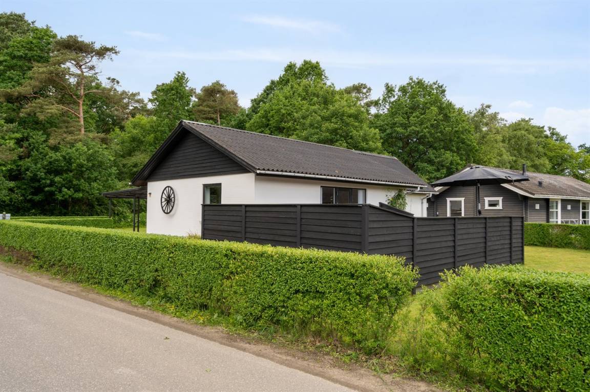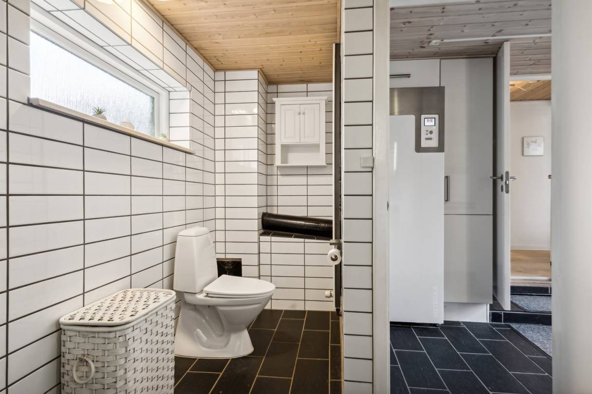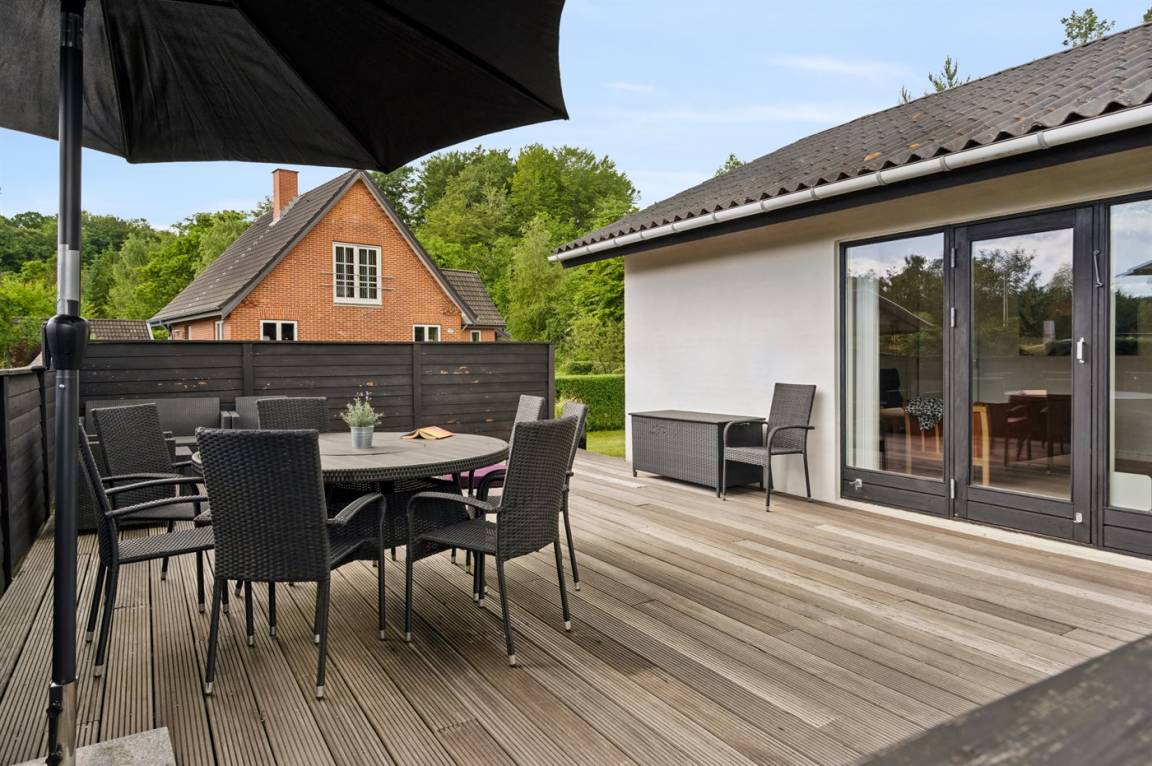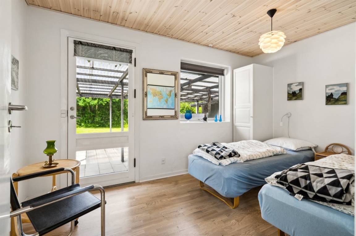 Das Haus verfügt über eine wirklich schöne Terrasse mit Gartenmöbeln und 2 Sonnenliegen, auf der man die wunderschöne Aussicht auf das Wasser in vollen Zügen genießen kann, und auf der anderen Seite des Hauses gibt es eine weitere schöne Terrasse, die überdacht und völlig ungestört ist, da das Grundstück an den Wald grenzt. Hier kann man die Stille in vollen Zügen genießen, und es gibt immer die Möglichkeit, einen geschützten Platz zu finden. Das Feriengebiet lädt zu Spaziergängen in der schönen Natur ein, und ein besonderes Erlebnis ist ein Besuch der Hvidbjerg Düne, die 7 Kilometer vom Haus entfernt liegt.