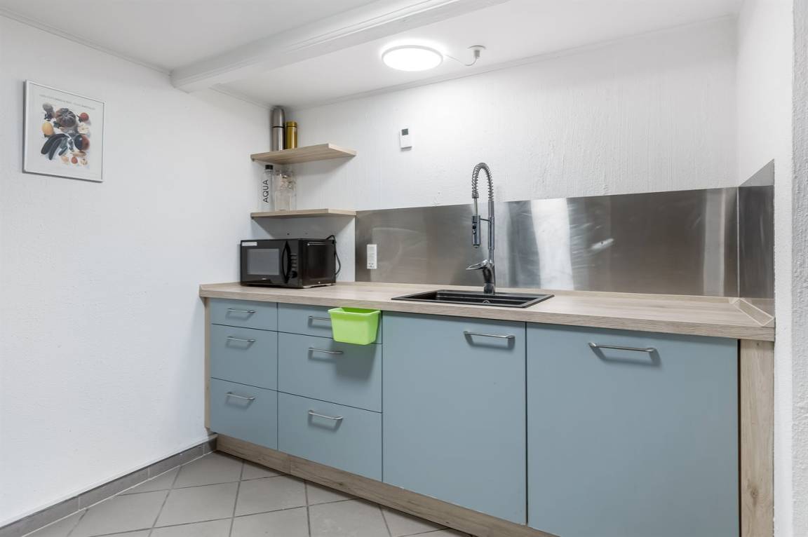 KücheDie Küche ist mit Kühlschrank ausgestattet. Außerdem gibt es ein Gaskochfeld mit 4 Brenner, Umluftofen, Mikrowelle sowie Geschirrspüler. Fußbodenheizung in der Küche.