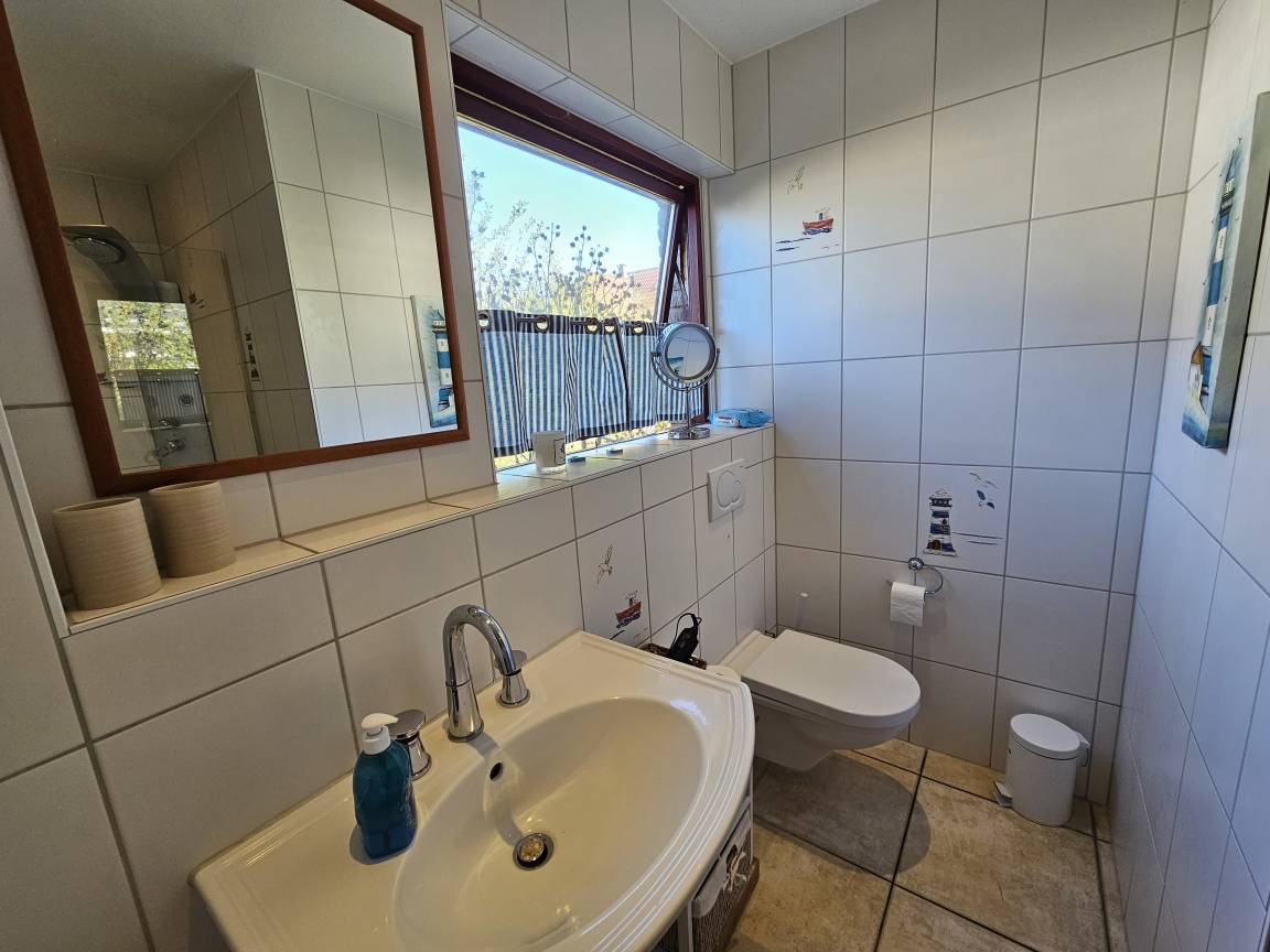 Beide Badezimmer sind vollwertig mit Dusche, WC und Waschbecken ausgestattet und im maritimen Ambiente des übrigen Hauses gehalten.