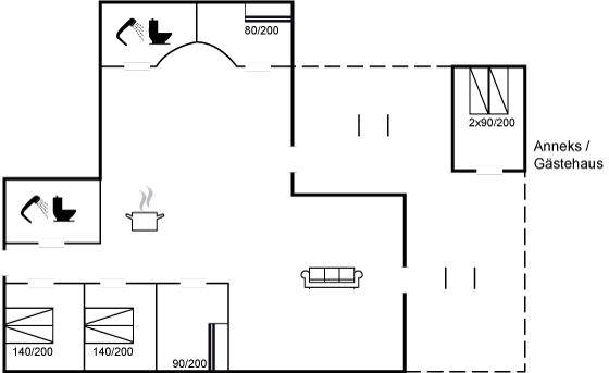SchlafverhältnisseDie Schlafplätze verteilen sich auf 5 Schlafräume. 4 Schlafplätze in Doppelbetten. 2 Schlafplätze in Einzelbetten. 4 Schlafplätze in Etagenbetten. 2 von diesen Schlafplätzen befinden sich im Gästehaus. Ferner steht ein Kinderbett zur Verfügung.