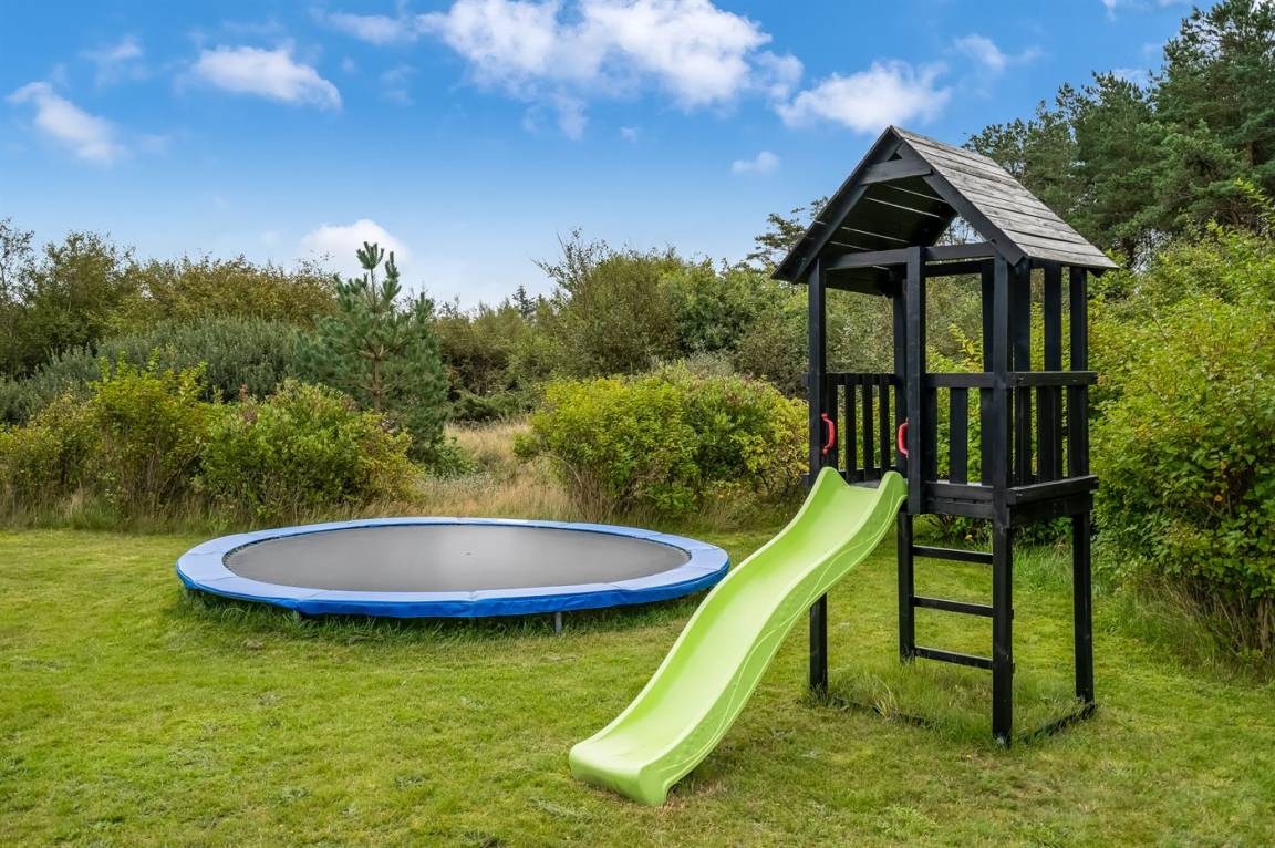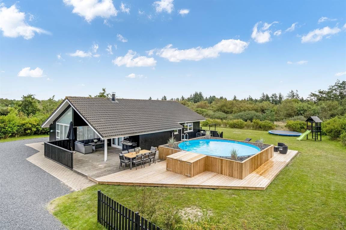 Das Ferienhaus liegt auf einem 1489 m² großen Naturgrundstück, 4.000 m vom Meer entfernt. Die nächste Einkaufsmöglichkeit befindet sich in einer Entfernung von 2.000 m. Zum Ferienhaus gehört eine 30 m² große offene, nach Süden ausgerichtete Terrasse. Außerdem gibt es eine 20 m² große überdachte Terrasse. Es gibt einen Geräteraum, eine Rutsche und ein Trampolin, einen Außenpool (beheizt mit Solarenergie) und Parkplätze am Ferienhaus.