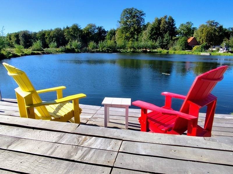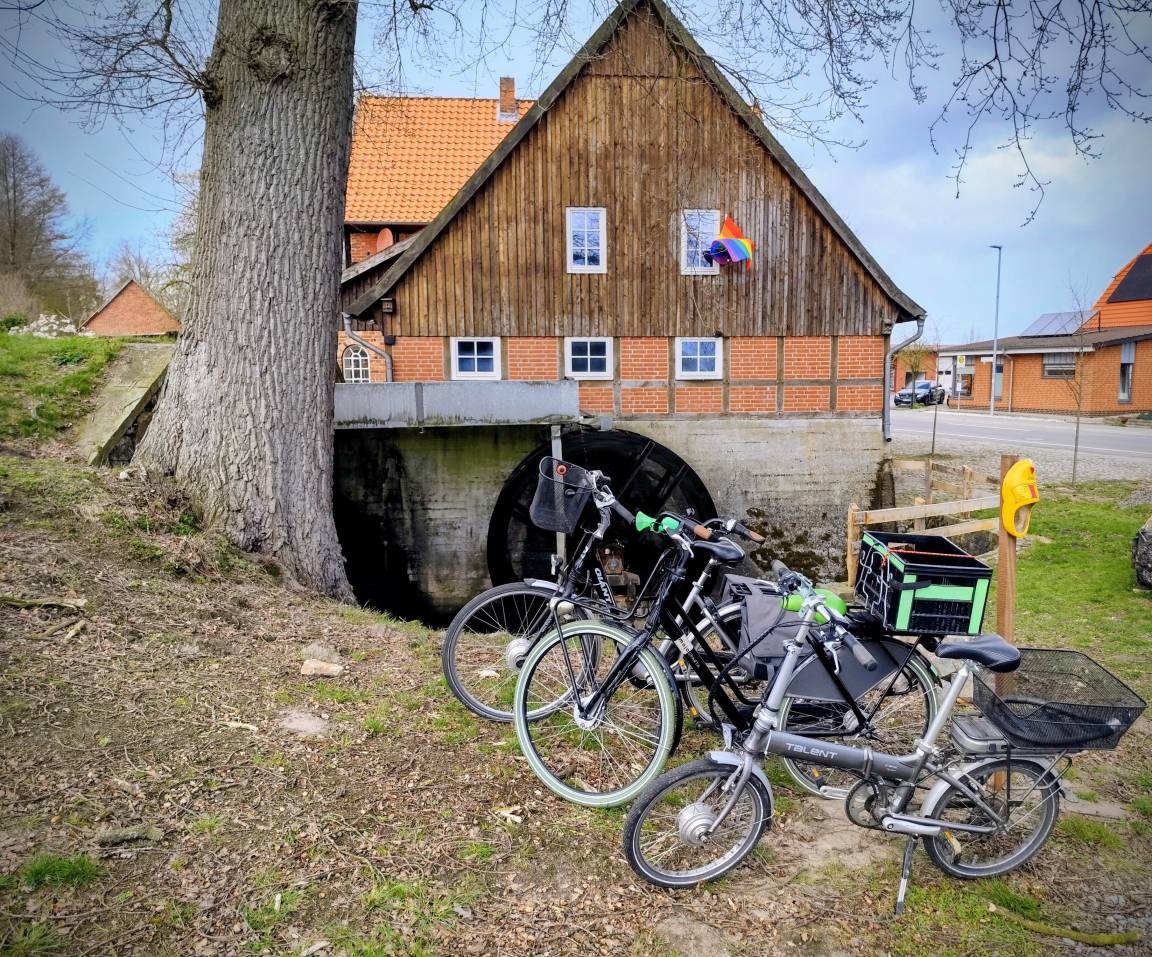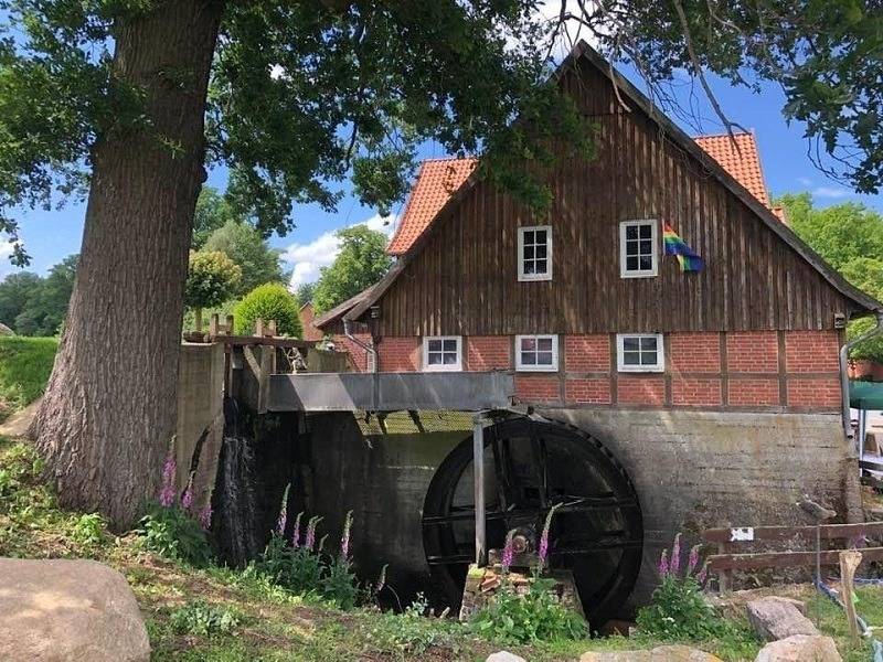 Großzügiges Doppelzimmer mit abgetrenntem Wohnbereich, Bad und Küche zur Mitbenutzung in einer historischen Wassermühle mitten in Niedersachsen. Schöner Garten mit Sitzmöglichkeiten am Mühlenteich. Baden im Mühlenteich möglich.