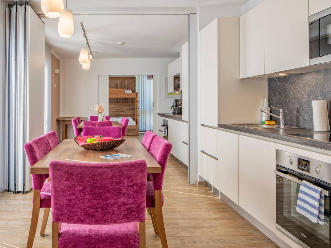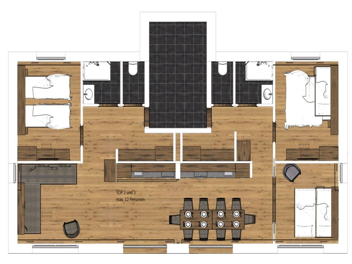 Layout : In der 1. Etage: 2x offene Küche mit Wasserkocher, Toaster, Kochherd(4 Kochplatten, elektrisch), Kaffeemaschine(Filter), Backofen, Mikrowelle, Geschirrspüler, Kühl-/Gefrierkombination , Wohn-/Schlafzimmer mit Hochbett 1 Person , Doppelschlafcouch , Wohn-/Schlafzimmer mit 2x Schlafcouch 1 Pers., Hochbett 1 Person , 2x Wohn/Esszimmer mit TV, Esstisch(6 Personen) , 2x Schlafzimmer mit Hochbett 1 Person , Doppelbett, TV , 2x Badezimmer mit Dusche, Waschbecken, Föhn , 2x Toilette